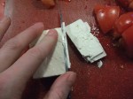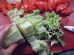 Je hache d’abord la laitue romaine comme dans la photo ci-contre. Ensuite je dépose les tomates en dés. Je tranche la feta très mince et je la brise sur les tomates. Puis je dépose les olives, j’éparpille (c’est un nouveau terme culinaire très en vogue à Paris, après l’immense succès de « coloration », « caramélisé » et « appareil », voici maintenant « éparpiller » – non c’est une blague)  l’oignon, et l’estragon si vous en avez du frais.