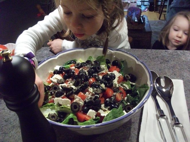 Voici donc the divine sexy greek salad « Ray Style ».  Quiz : il manque un ingrédient. Et oh! Les petites souris s’en viennent grignoter…