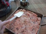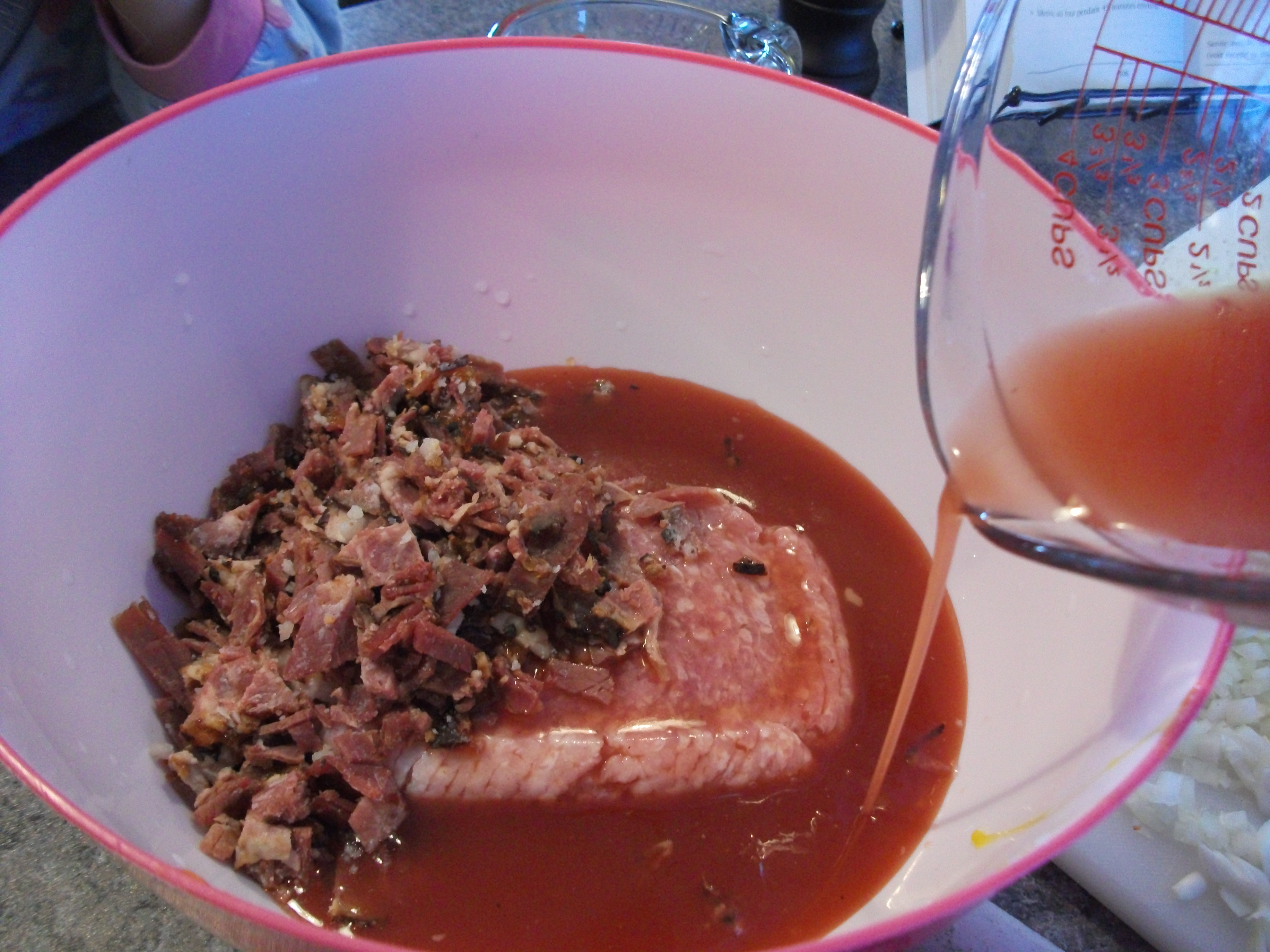 Le boeuf. Premier obstacle, je n’ai que du porc haché. Et… ah! Un p’tit reste de smoked meat… Et une saucisse hot dog tout boeuf qui traîne et qui me supplie de mettre fin à ses jours. On repassera pour la santé! Je hache ces cochonneries et les fait disparaître dans le porc haché, tel un cadavre qu’on voudrait cacher. Faut croire que ça n’a pas marché, c’est le smoked meat qui donne l’effet « canneberges » sur la photo…