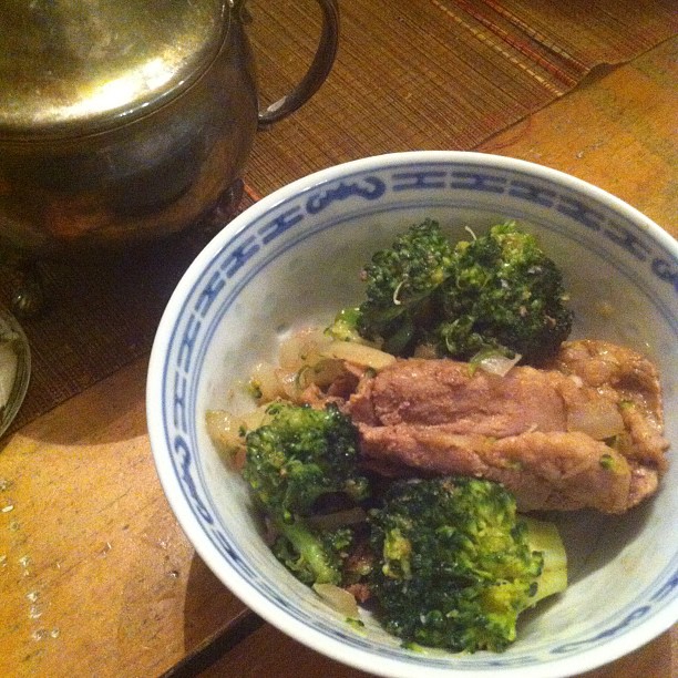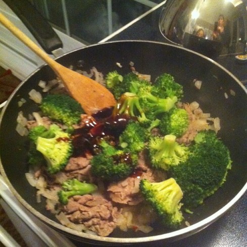 Il ne me manquait qu’un ingrédient (oups!), la sauce à fondue hoisin et moutarde qui brillera par son absence, et malgré que j’aie des oignons verts, va savoir pourquoi, j’ai utilisé un oignon jaune. Ambassadrice québécoise. Et puis, quand je suis pressée, je fais cuire les légumes vapeurs à côté, en marguerite, et les rajoute à la fin pour m’assurer qu’un hurlement d’enfants ne me fasse pas interrompre le sautage des légumes. Aujourd’hui : têtes de brocolis déjà coupés de chez Costco (un énorme sac pour 5-6$ : on dit « merci Costco »). On repassera pour les « légumes variés au choix ». J’ai finalement servi tel quel, sans le riz ou les vermicelles. On essaie d’éviter les féculents sur semaine, question de rester en bons termes avec la balance.