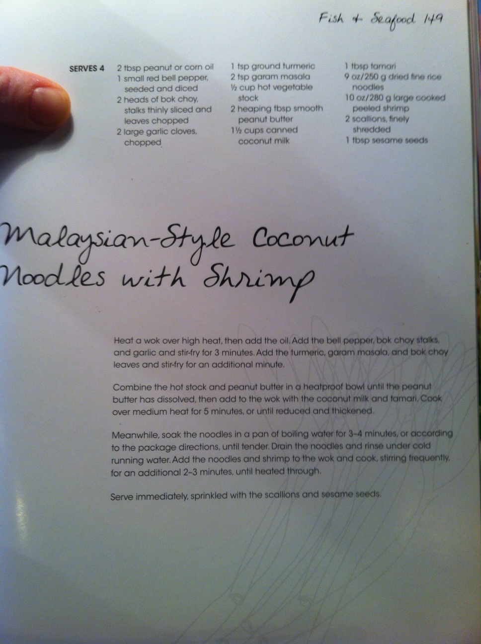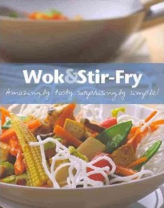 Je n’avais aucune viande fraîche dans le frigo, la solution : les crevettes congelées. Je les mets dans une passoire qui est déposée dans un bol d’eau chaude. Je fafouine un peu dans mes livres, et je tombe sur une recette qui m’inspire. Le livre : Wok & Stir-Fry, déniché chez Winners pour un gros 8 piastres, publié par Parragon Books. Qu’est-ce qu’on dit à Winners? Vous connaissez la réponse.