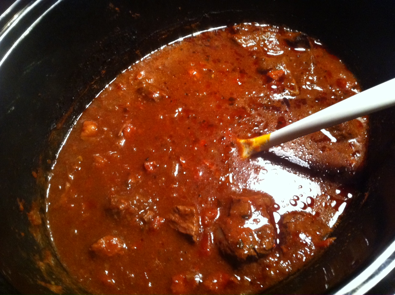 Verser sur le boeuf, couvrir et mijoter à feu bas pendant (8 heures) – Autrement dit, pesez-sur-le-piton. Tout le monde ensemble : Alléluia!