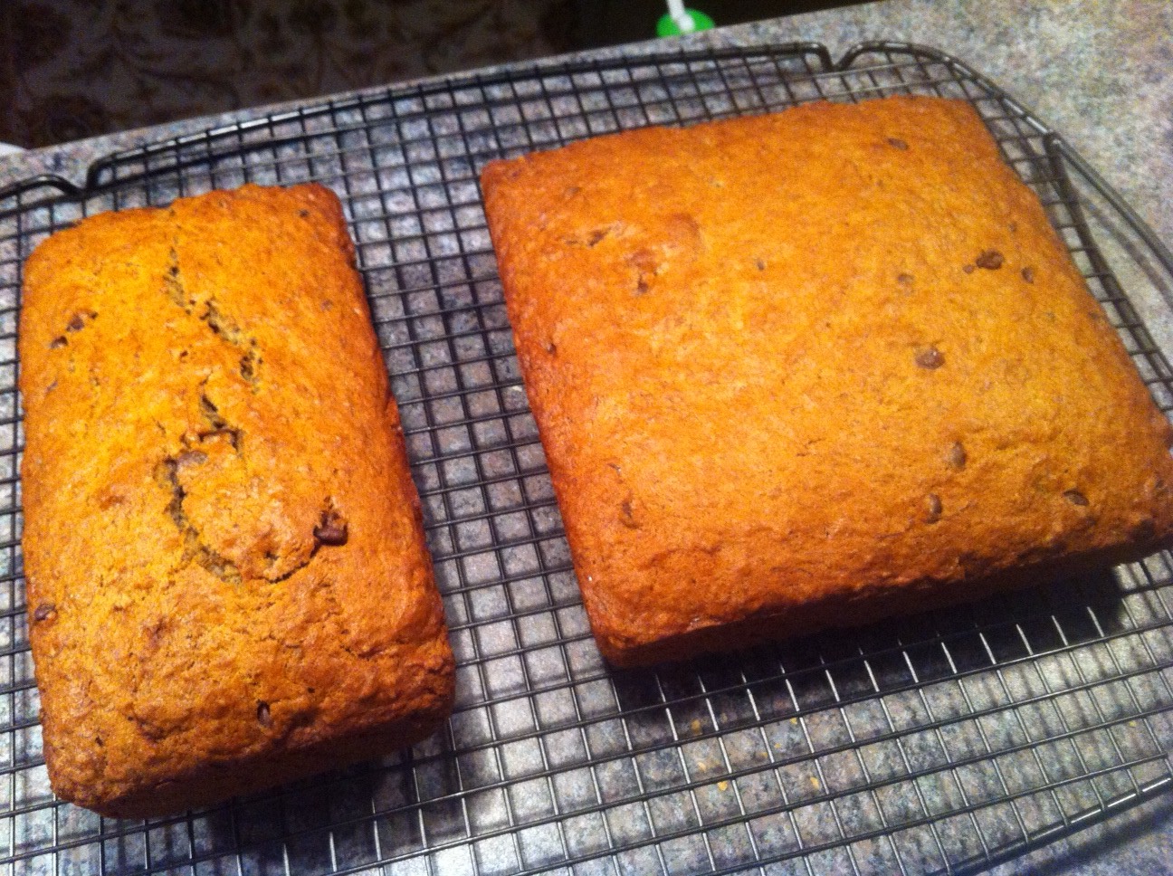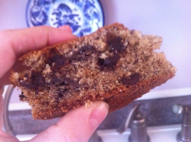 Comme j’avais beaucoup de bananes à passer (plus aucune dans mon congélateur, yé!!!), j’ai doublé la recette mais j’ai pris moitié-beurre moitié-huile de canola pour soulager ma conscience. J’ai aussi remplacé le chocolat mi-amer par mes bonnes vieilles pépites vendues en format « camion à benne » chez Costco. Voilà mes foutus compromis qui sont de retour. Chassez le naturel et il revient au galop… grrrr!