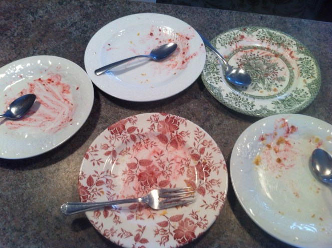 Verdict? Et bien ce sont des pâtes, c’est certain que les enfants ont aimé, quoique missy Charlotte a repoussé tous les oignons de la sauce… En tout cas moi, j’ai bien aimé, mais j’avoue que le basilic frais me manquait. Et le dessert? Je vous en juger par cette photo éloquente…