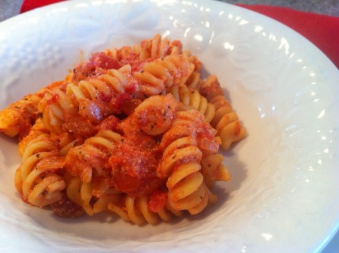 Comme j’avais des tomates en boîte à passer (as usual!), j’ai cherché sur Google et j’ai trouvé ma recette de pâtes sur le site Délices du Monde.
