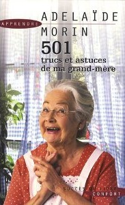 On progresse toujours dans le temps, mais cette fois, la yeule au complet me tombe avec cette magnifique couverture d’Adelaïde Morin – 501 trucs et astuces de ma grand-mère : on se sait pas trop si c’est un livre de cuisine ou d’horreur. Mettez un couteau à la main de mamie, et voilà la nouvelle Dexter des années 2000. Pauvre mamie, exploitée sans merci…