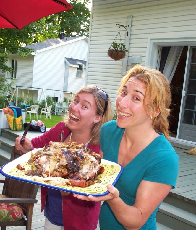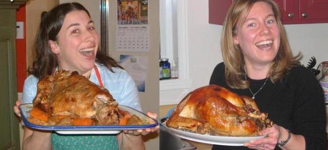 Du coq à l’âne, ça me mène à ceci : la photo des brouteuses ne peut m’empêcher de me faire penser à ma série de photos « pauses de dinde », un concours très sophistiqué entre ma chum Annie et moi… Nul doute que notre état d’âme est puisé à la même source d’inspiration. Nous avons ce magnifique sourire béat catégorie cerveau à off. Devinette : la dinde, est-ce ma chum Annie, moi, ou la volaille?
