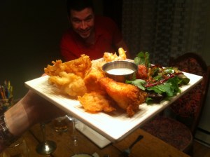 Du plaisir, du plaisir, du plaisir. Tout le monde a participé à l’étape cruciale de la friture (on faisait la chaîne humaine), le poisson était excellent, la paella savoureuse et pleine de goût, et le spectacle d’un dessert flambé a toujours son effet, même si notre flamme était plus ou moins surprenante (« y manque de rhum! Envoye, ajoute du rhum! Allume encore! Envoye, ça prend une belle photo pour le blogue à Rachel! »). Et on a finit la soirée dans le salon d’apparat avec la chaise vibro-massante et mon apps de tarot sur iphone, sur fond de Loreena McKennitt. « Calmez votre esprit, puis posez votre questions… ». Encore une belle soirée avec mes amis(es) chéri(es). De la grosse paresse effouarée dans le salon. Ne suis-je pas chanceuse?