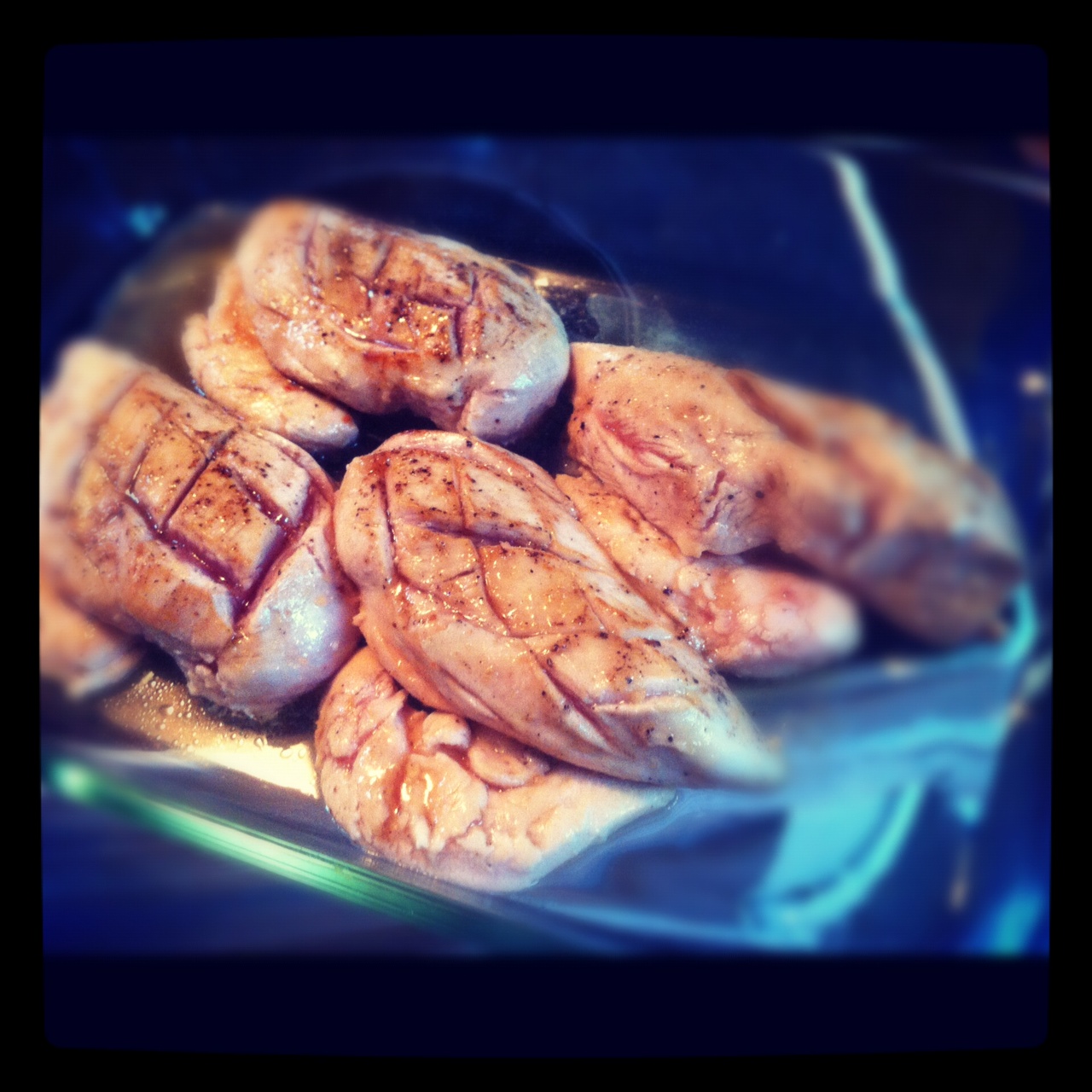 3. Sur un côté des poitrines de poulet, former un quadrillage en pratiquant des incisions de 2 mm de profondeur à 2 cm d’intervalle. Ceci permettra au sirop de bien pénétrer dans la viande. (comme je n’avais pas de peau sur mes poitrines, j’ai fait des croisillons directement dans la chair, sinon faites-le dans la peau)