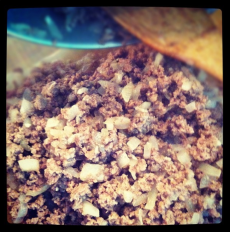 – 3-4 gousses d’ail émincées : J’ai utilisé l’ail de Véro et Alex, cultivé en sol sherbrookois – notez la grosseur des gousses. Je me suis contentée de deux !