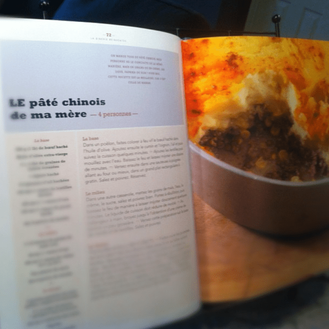 Je feuillette dans ma collection de livres ceux qui seraient propices à me livrer la marchandise… Je tombe finalement sur la recette de Louis-François Marcotte, qui se trouve à être la recette de sa mère. Merci Soraya (qui m’a gentiment prêté le livre Simple et Chic), tu me permets de concocter un classique québécois, façon Louis-François Marcotte. Du cumin dans un pâté chinois? Ah bon!
