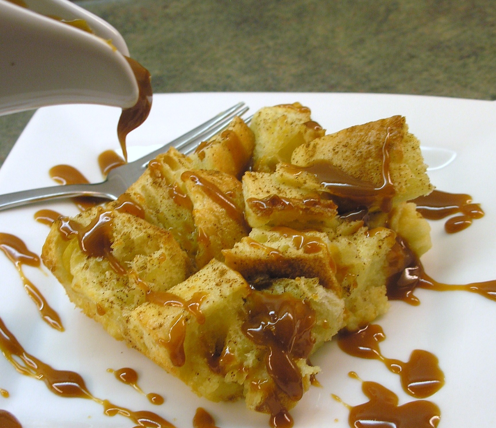 Donc vous en chauffez une quantité au goût au micro-onde, léchez la cuillère bien comme il faut avant de la mettre au lave-vaisselle et ensuite noyez votre pudding au pain de cette délectable matière onctueuse. J’y suis allé de façon restreinte pour la photo mais ne vous inquiétez pas, j’en ai rajouté après. Quand même, une fille ne veut pas avoir l’air trop cochonne!