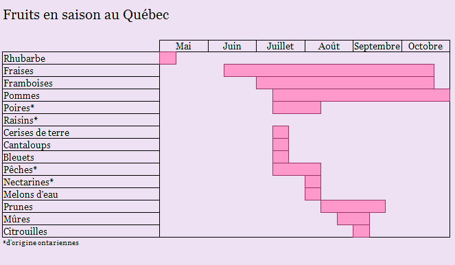 Là, j’avais beau chercher sur les Internets, je ne trouvais aucun tableau des fruits en saison au Québec. Voyons donc! Ben j’en ai fait un juste pour vous, mes cocos :