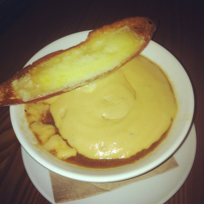 Dans un décore plus épuré, on nous sert une délicieuse soupe à l’oignon en « cappuccino » surmonté d’un espuma (yéééé!) et d’un croûton à l’Hercule de Charlevoix :