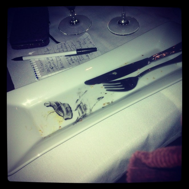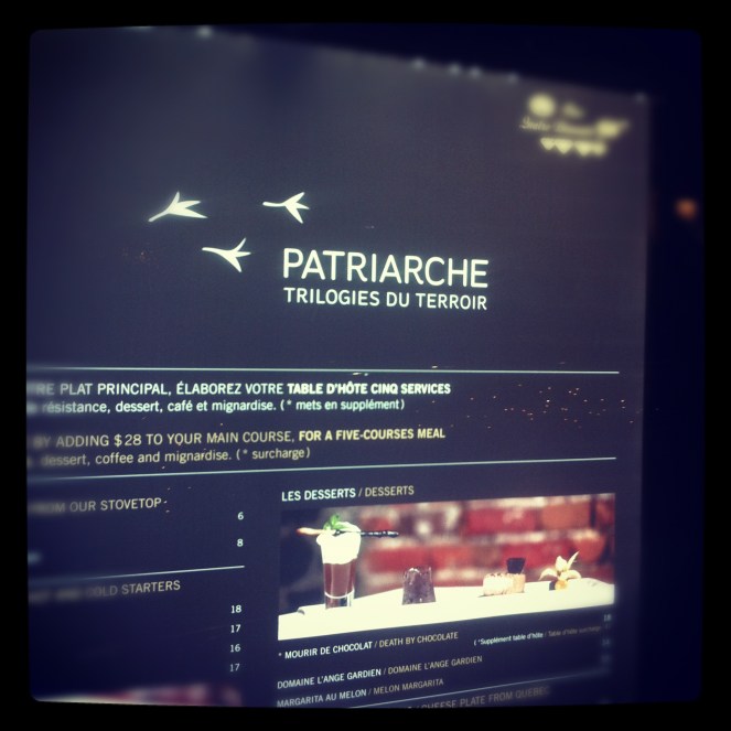 Seconde bouchée : Attachez votre tuque avec de la broche. On nous a servi une terrine de saumon mi-cuit entouré d’une bisque de homard, d’encre de seiche (vous savez, quand la pieuvre a peur dans Nemo? Elle expulse un liquide noir? Oui, c’est ça!) et d’agar-agar, le tout couronné d’une tuile légèrement sucrée et à l’estragon. Wow. Exécution parfaite. Ça m’a tout de suite fait penser au damier d’asperges et bavarois que le compte Twitter de Zeste m’avait suggéré d’essayer quand je me suis targuée d’avoir réussi un soufflé de Sabrina Tutino. C’est une coche au dessus, sûrement un beau défi pour Francis Laplante de Tranchedepain.com… Je vais me contenter de maîtriser mon syphon avant de plonger dans ce niveau de difficulté.