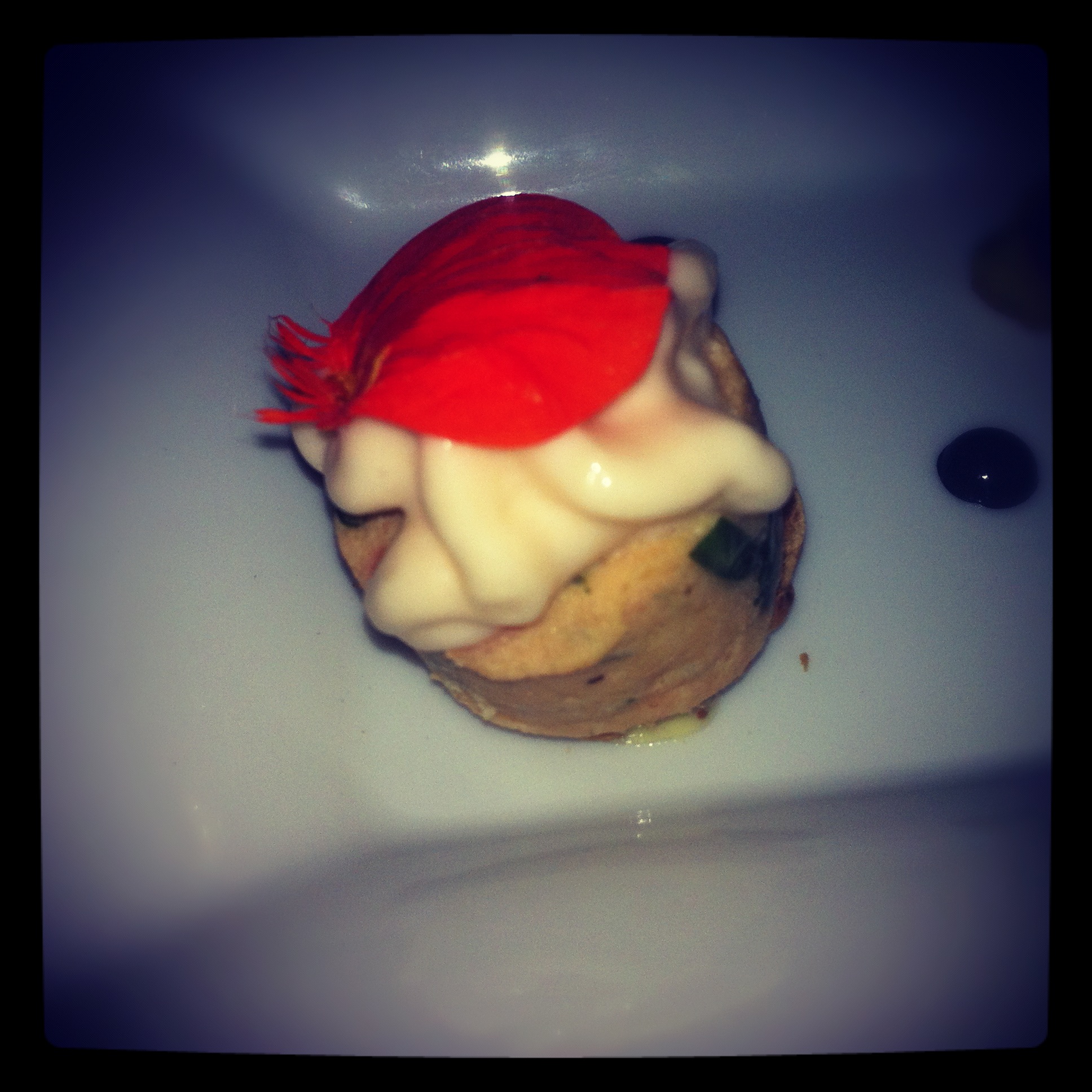 Première bouchée : Vous la voyez ci-contre en photo. C’est un creton de saumon sur croûton, surmonté d’un espuma de saumon fumé (re-yéééé!). Ça fondait dans la bouche.