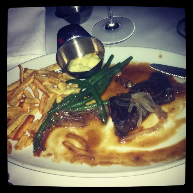 On nous a servi de l’onglet de boeuf (une nouveauté pour moi) macéré dans du vin rouge et des oignons, servi à point, et accompagné de fèves vertes et de frites. La texture ressemble un peu à celle de la bavette. Très fibreux mais très goûteux. J’ai tellement dévoré mon assiette que j’ai dû prendre une photo de l’assiette de mon voisin :