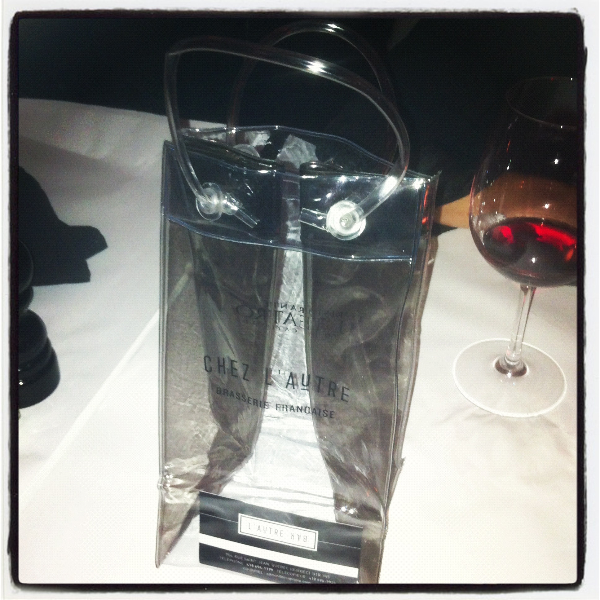 Le vin qui accompagnait cette assiette costaude, le chianti Peppoli, fut servi en généreuse quantité et accompagnait très bien notre plat. On nous a même donné un petit cadeau avant de partir, un sac à vin blanc que l’on peut remplir de glace :