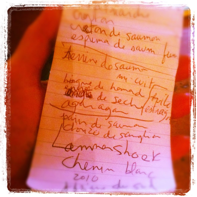 Nos bouchées étaient accompagnée d’un vin blanc si bon (ma chum Nancy ne cessait de me répéter « ça c’est en plein mon genre de vin! ») qu’on en a commandé un second verre. Il s’agit d’un chenin blanc d’Afrique du Sud, le Lammershoek cuvée 2010.