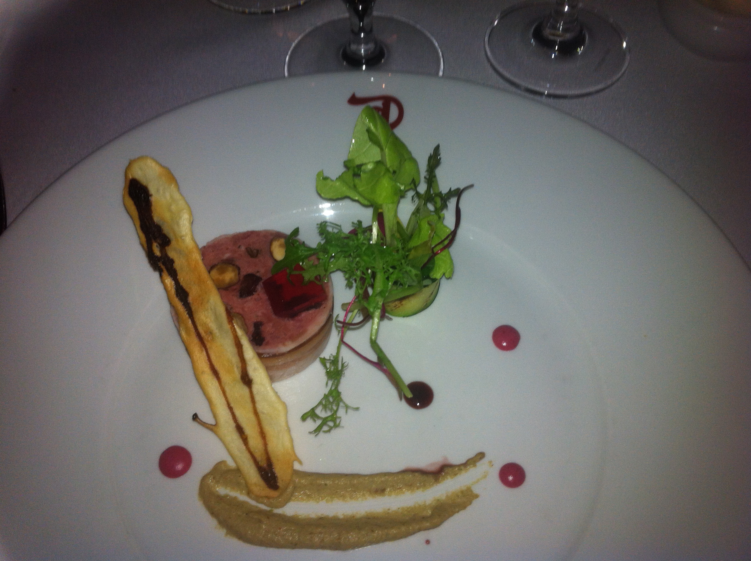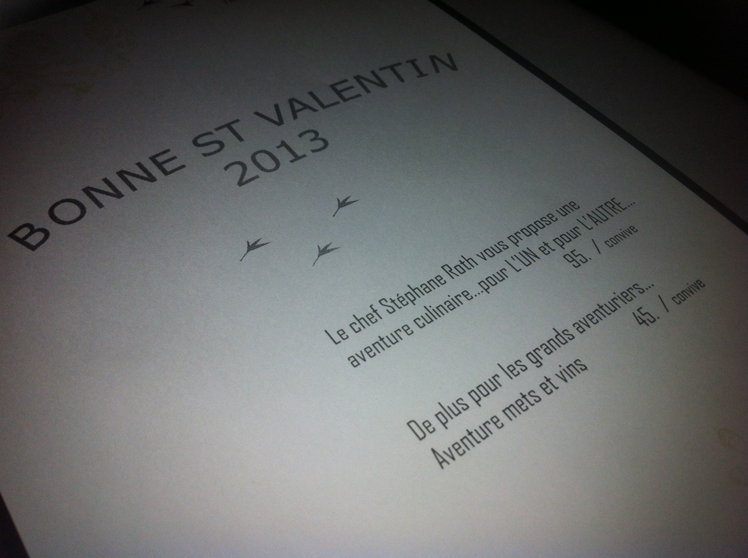 Je m’étais donc promise d’y retourner pour vivre l’expérience au complet. Mon chum et moi y avons réservé une table en février dernier pour célébrer la Saint-Valentin. Joie et bonheur, la madame était contente. Le propriétaire (ou maître d’hôtel pour les puristes) Guy Collin nous a accueilli tout sourire, nous expliquant gentiment la progression du restaurant depuis ses débuts, en passant par l’association avec son présent chef Stéphane Roth et leur succès de plus en plus local (en se basant entre autres sur les statistiques de visites sur son site Internet). Le restaurant a décroché quatre diamants à chaque année depuis 2007. Vous commencez à saliver? Je ne vous fais plus attendre.