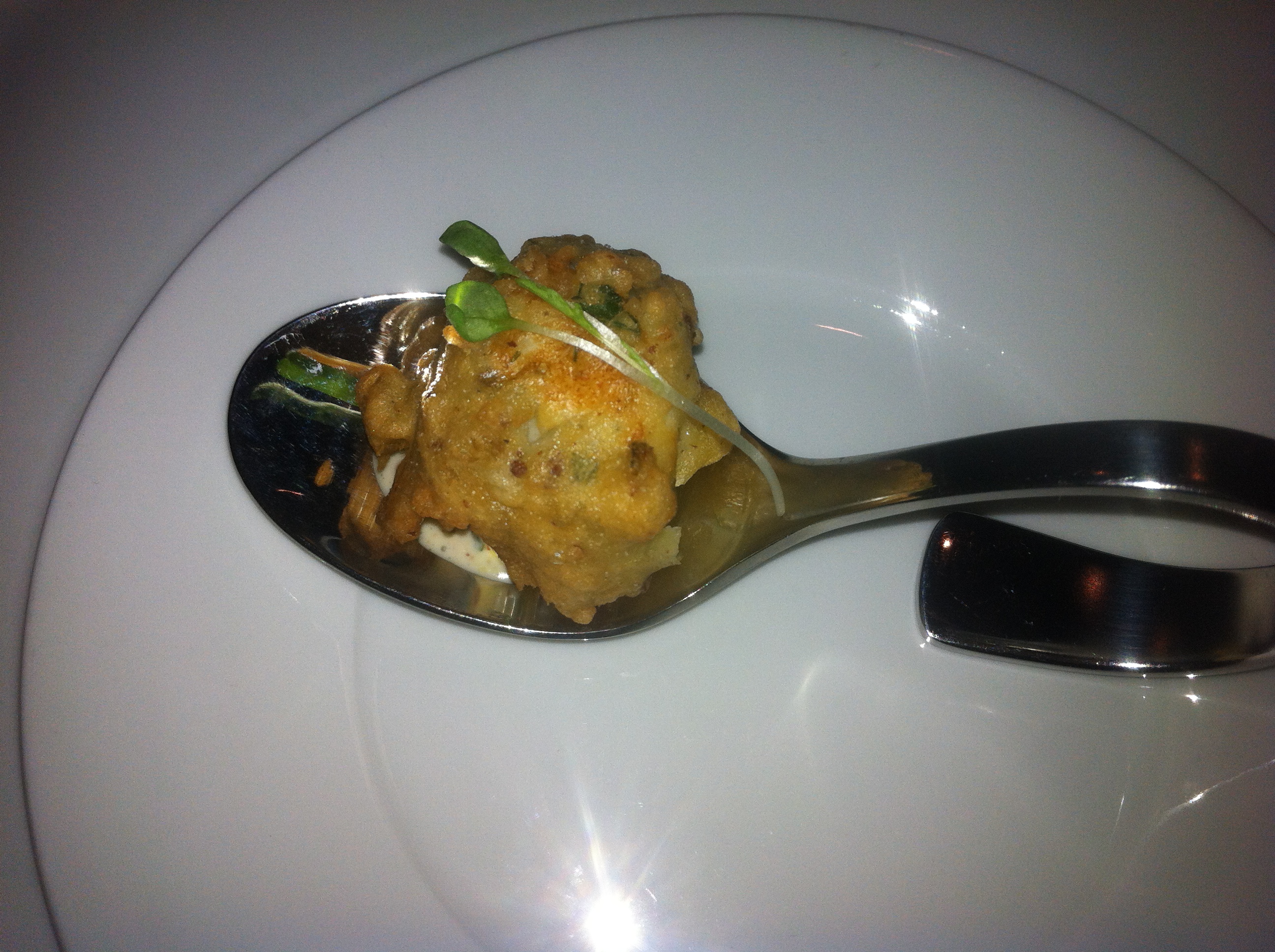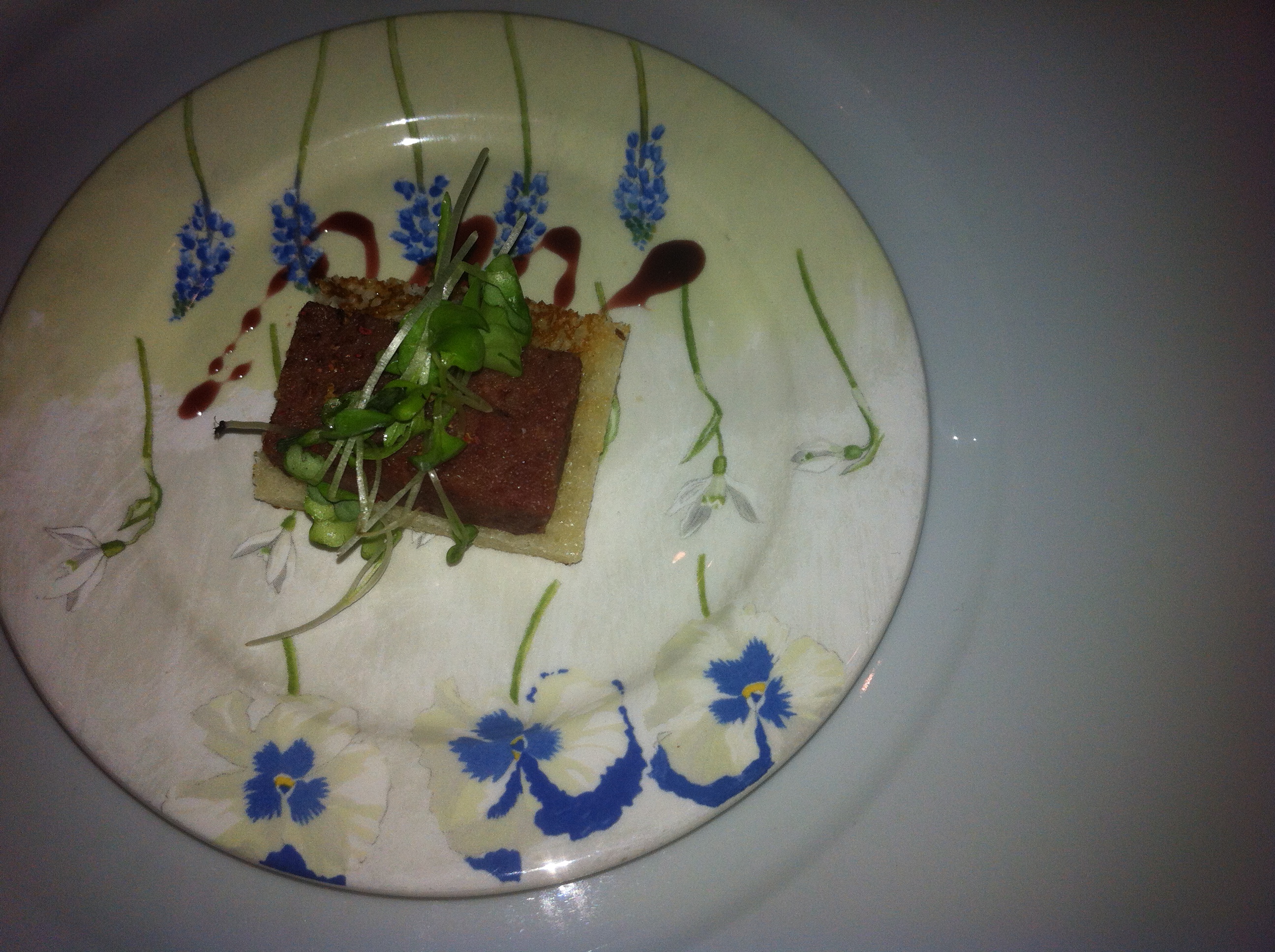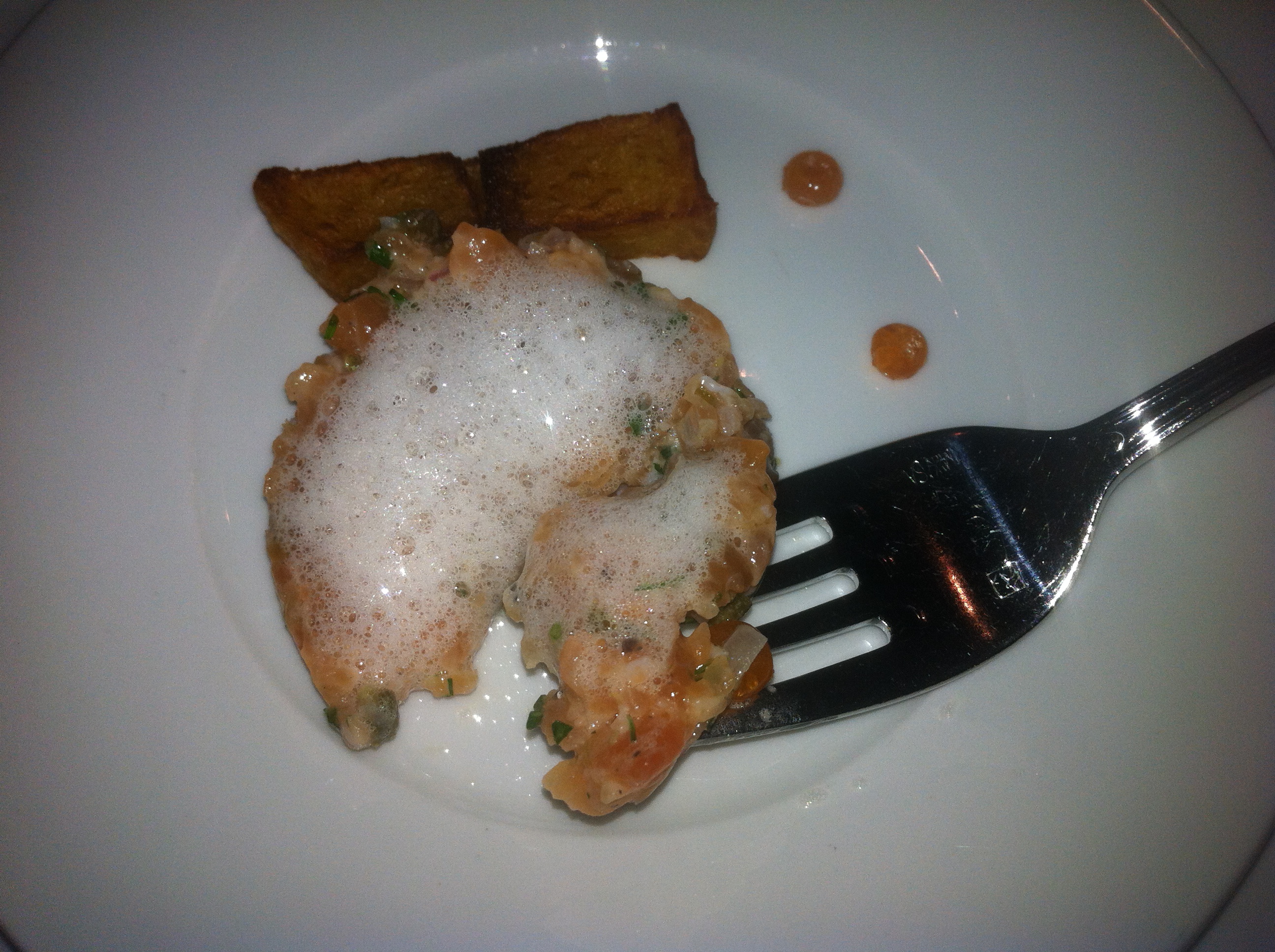 Tartare de saumon aux herbes, écume de palourde à l’anis (j’adore les subtiles insertions de saveur d’anis) :