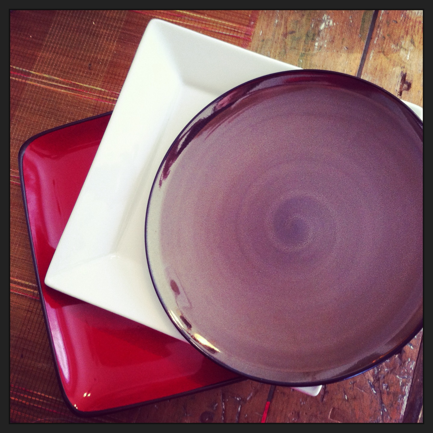 Poursuivons. Tiens, de belles assiettes. Je suis un peu tannée de mes assiettes rondes blanches insipides, ça ferait du bien au portrait d’avoir de nouvelles assiettes pour mes belles photos de blogue « instagramées »… J’ai même eu l’audace de dealer un 10% sur la rouge qui était un peu égratignée… Héhé!