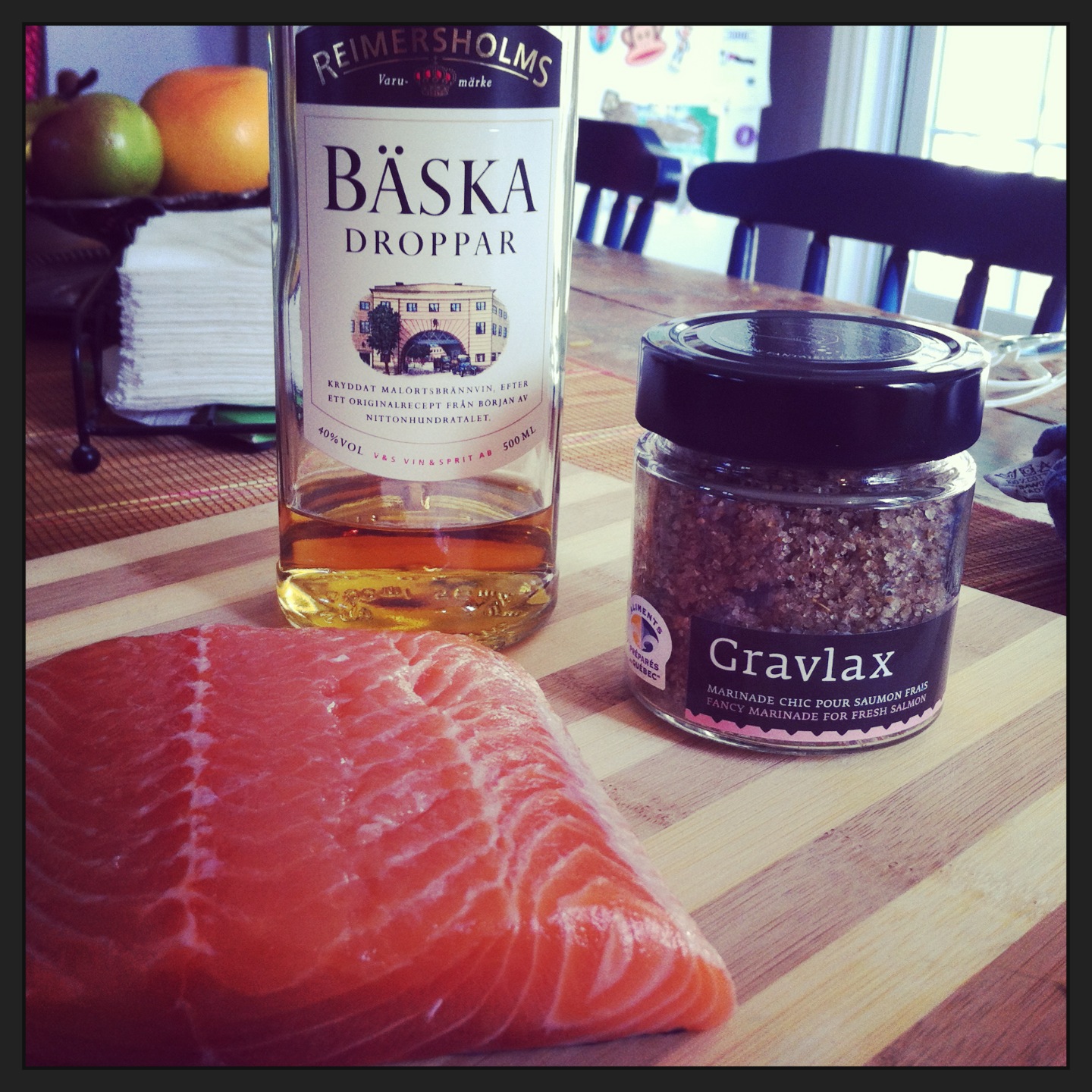 2. Badigeonner les morceaux de saumon côté chair avec l’alcool de votre choix. Le mien s’arrête sur une eau de vie nommé Bäska Droppar, laissé en héritage par notre cher ami suédois aujourd’hui citoyen de Lyon. Il aura maintenant le loisir, chanceux de lui, de visiter tous les bouchons, ces petits restaurants « où l’on mange des spécialités, dont le tablier de sapeur, les quenelles, la salade lyonnaise et la cervelle de canut », le tout dans une ambiance qui se doit d’être simple et conviviale. Pardonnez ma longue parenthèse, c’est que voyez-vous, j’ai une fixation sur les bouchons lyonnais depuis que j’ai reluqué sur Internet l’album photo de voyage de Lyon des propriétaires du Bouchon du Pied Bleu, notre petit bouchon sur St-Vallier à Québec.