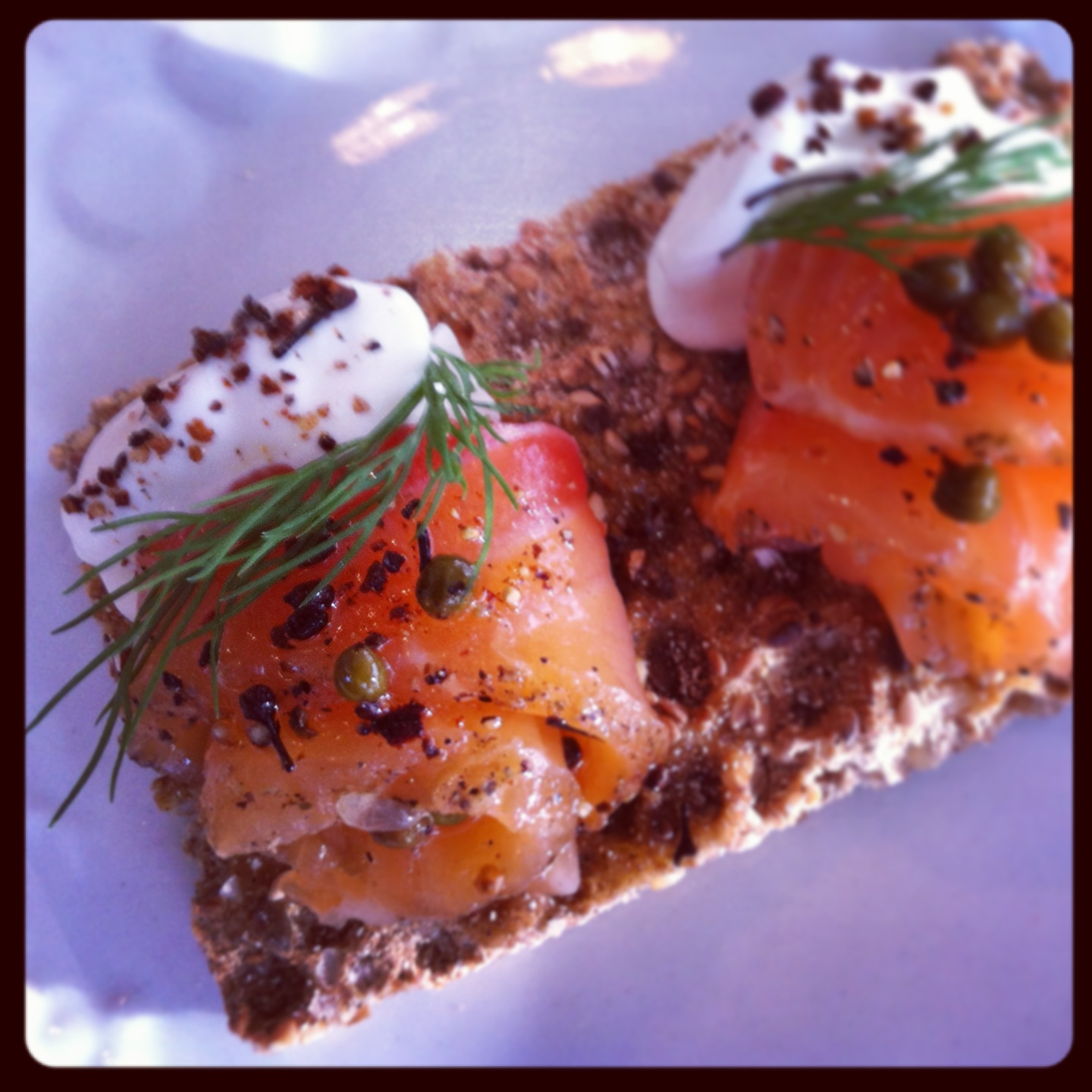 Si vous connaissez la grosseur des craquelins Ryvita, vous saurez que le titre est mensongeur. En fait, il se présente comme deux bouchées, mais seuls les hommes de grande proportion pourront réussir le défi. Et si vous aviez pu constater mon sourire de satisfaction instantané après avoir y avoir goûté, vous comprendriez que c’est une réussite sur toute la ligne. Le croquant du craquelin, le moelleux de la crème, le frais du saumon, le piquant du poivre, l’aigreur des visses, la fraîcheur de l’aneth, tout y était.