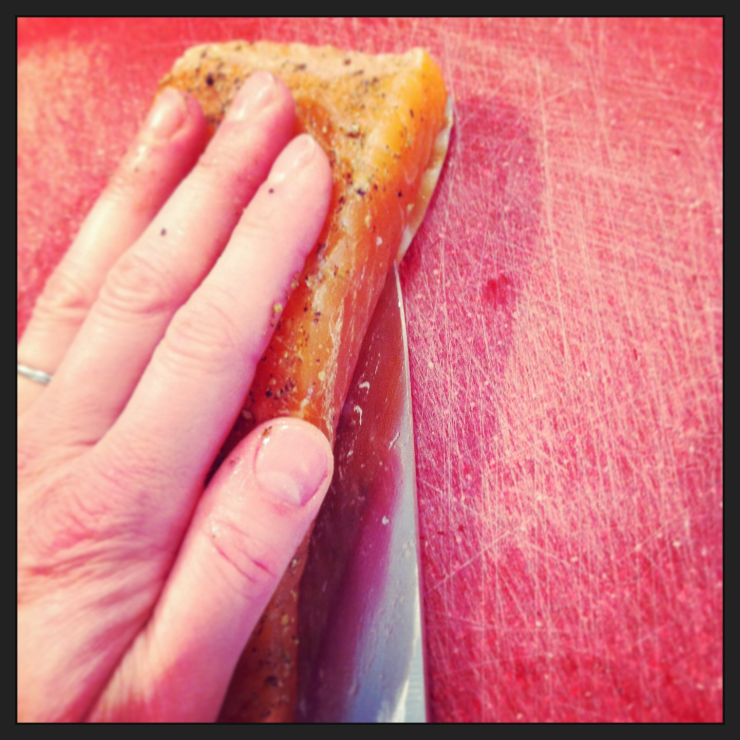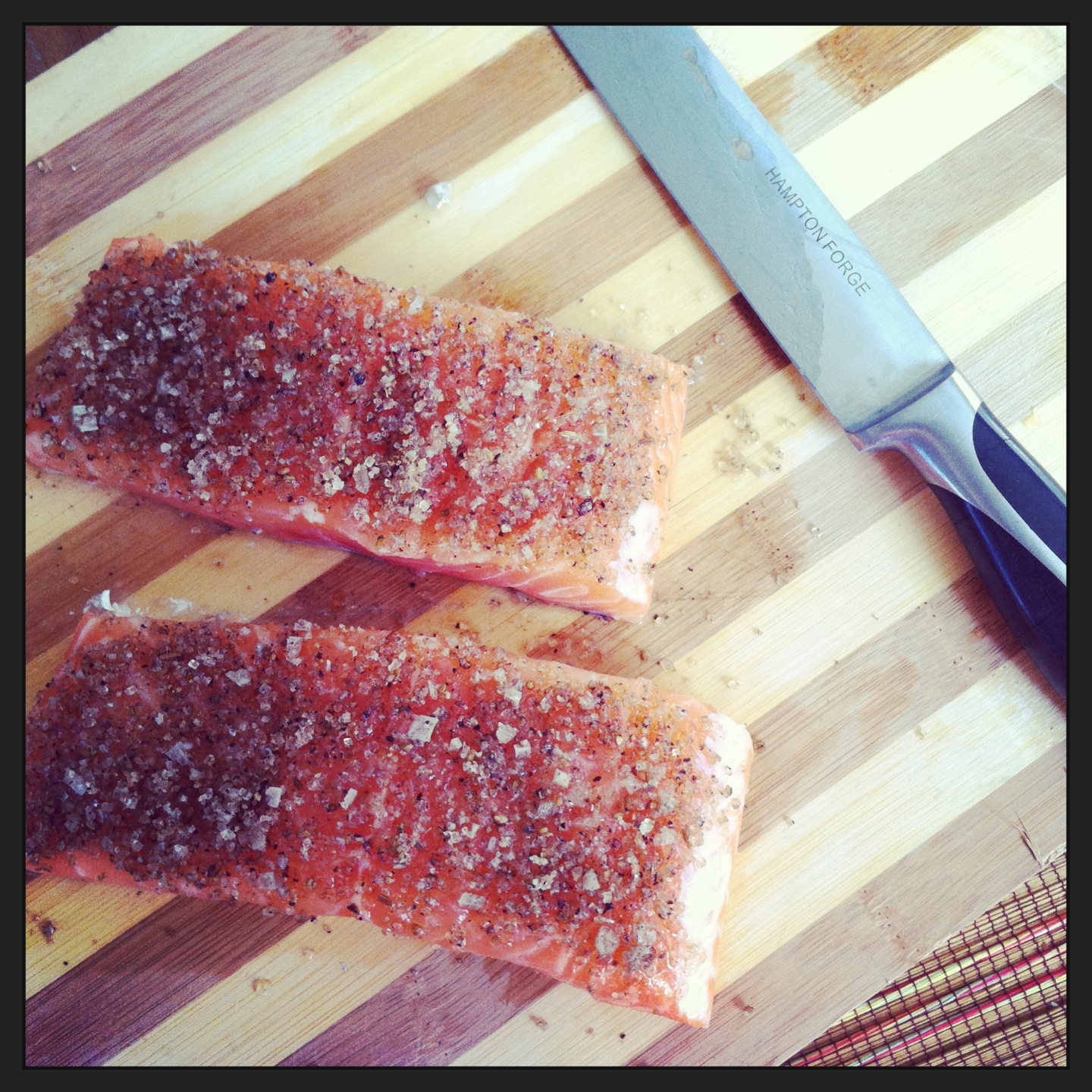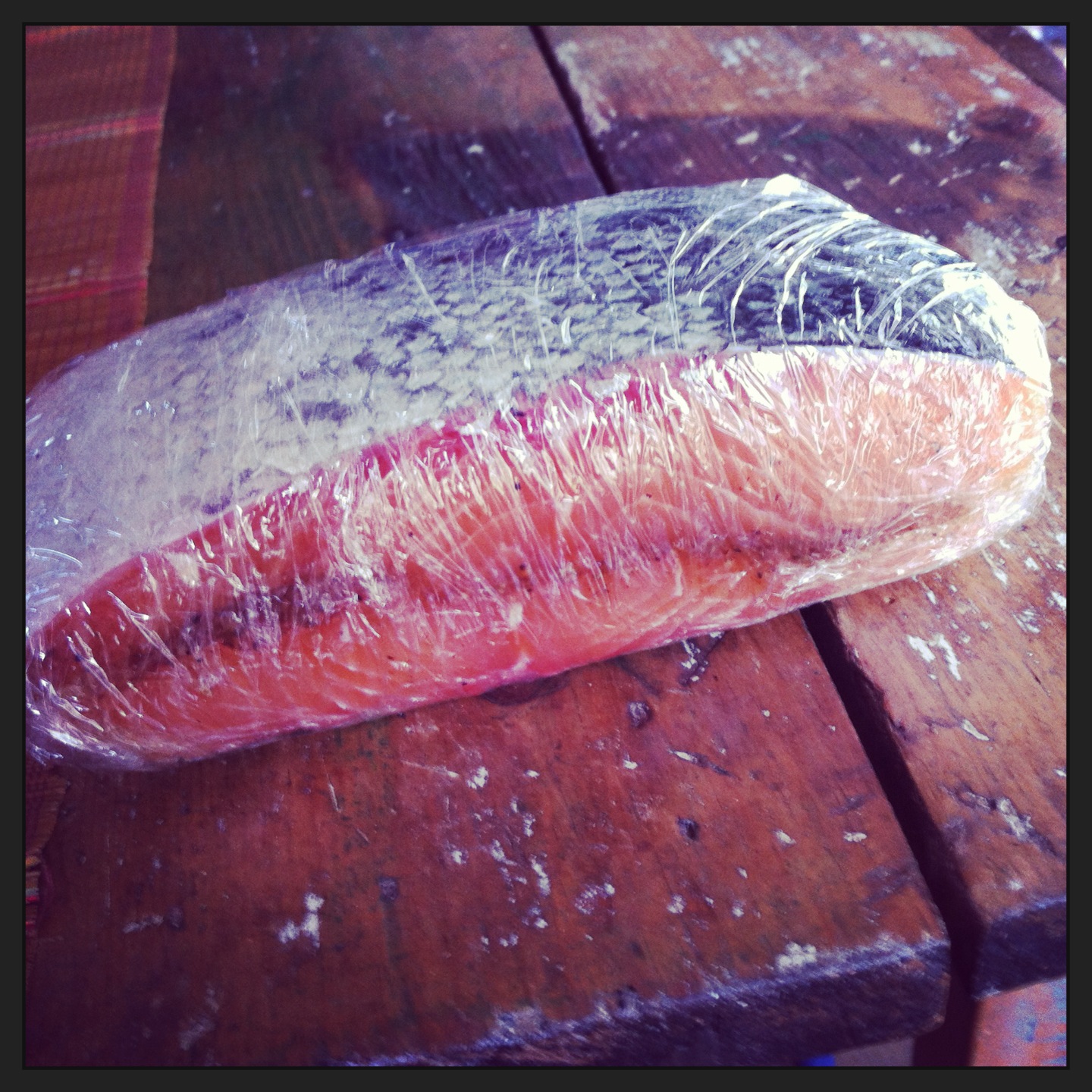 2. On recouvre entièrement de La Pincée Scandinave · N°4, on joint les deux pièces face à face, on enroule dans du papier cellophane et on met au frigo pour trois jours. Certains préféreront assécher au bout d’un jour ou deux et de rajouter le sel épicé au besoin (ce que j’ai fait).