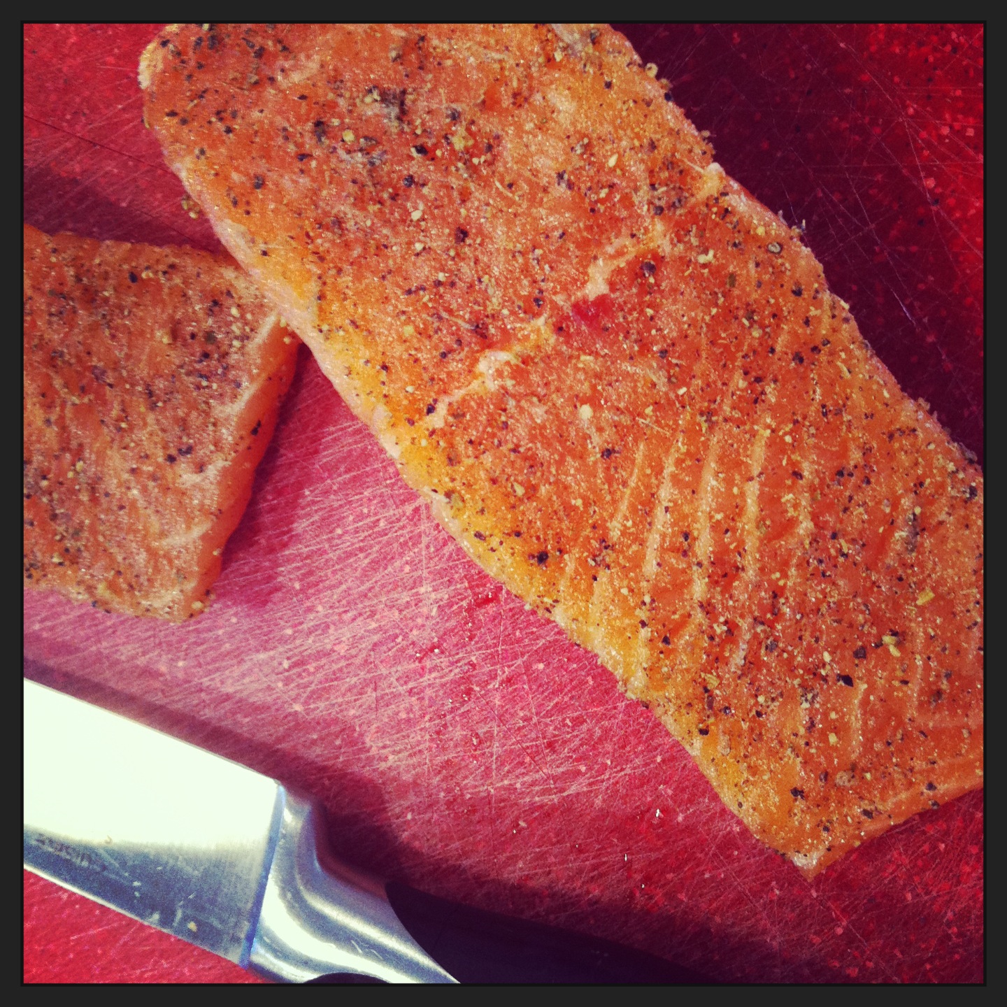 1. Préparer le saumon trois jours avant de servir. Couper le saumon en deux morceaux d’égale grosseur.