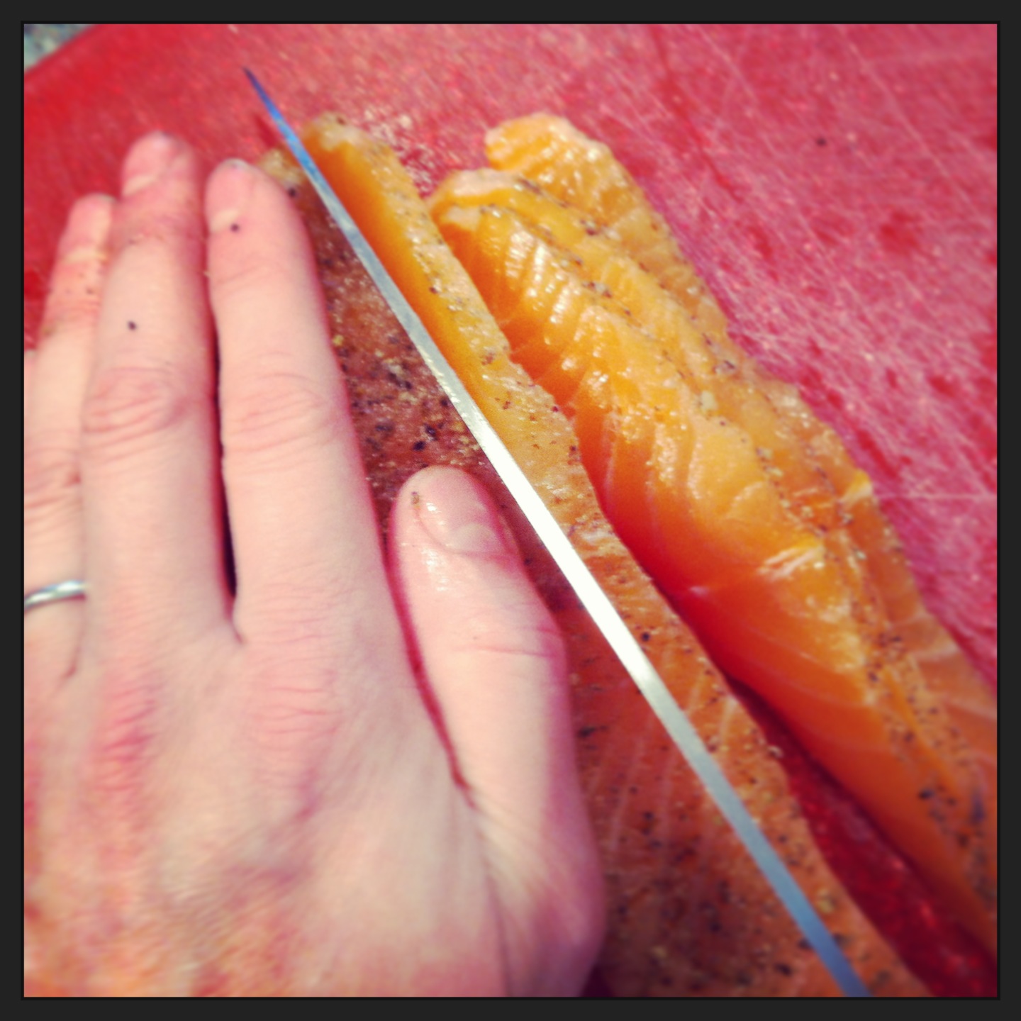 3. Trois jours plus tard, on nettoie le saumon de l’excédent de sel épicé à l’aide d’un linge sec, on retire la peau et on tranche en fines lamelles.