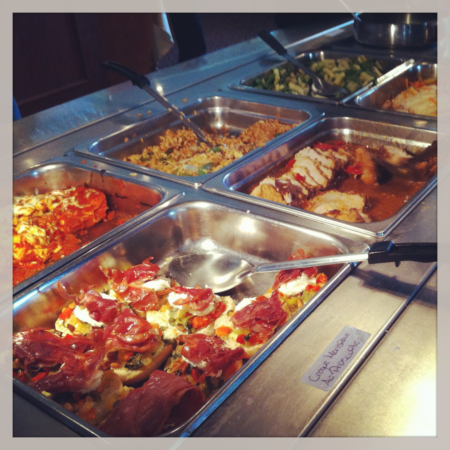 Au buffet du midi, délicieux croque-monsieurs au chèvre et prosciutto, légumes savoureusement assaisonnés, tout comme le filet de sole.