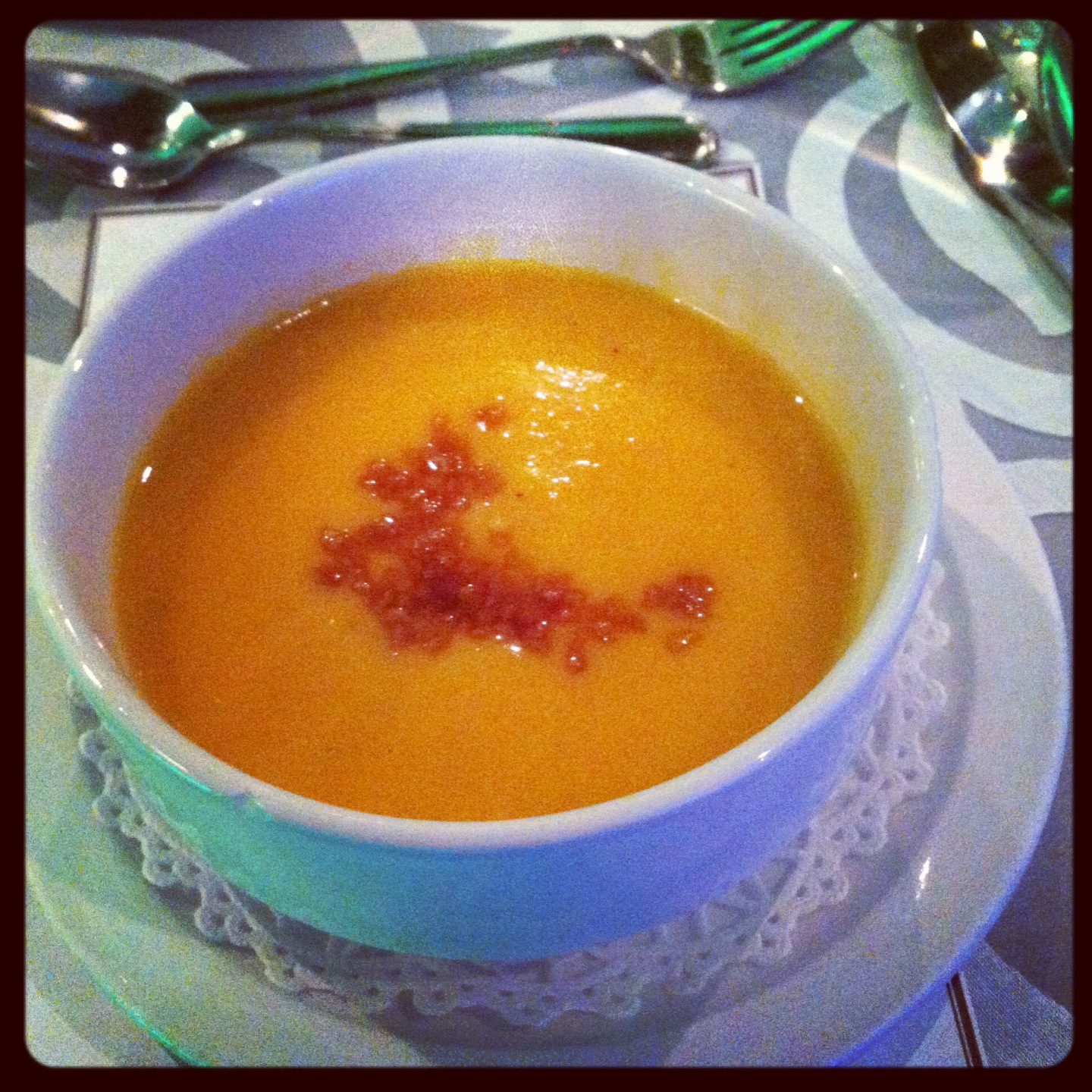 Suivie d’un potage butternut, érable et muscade (les croquants à l’érable, une agréable surprise trônant au centre du potage) :