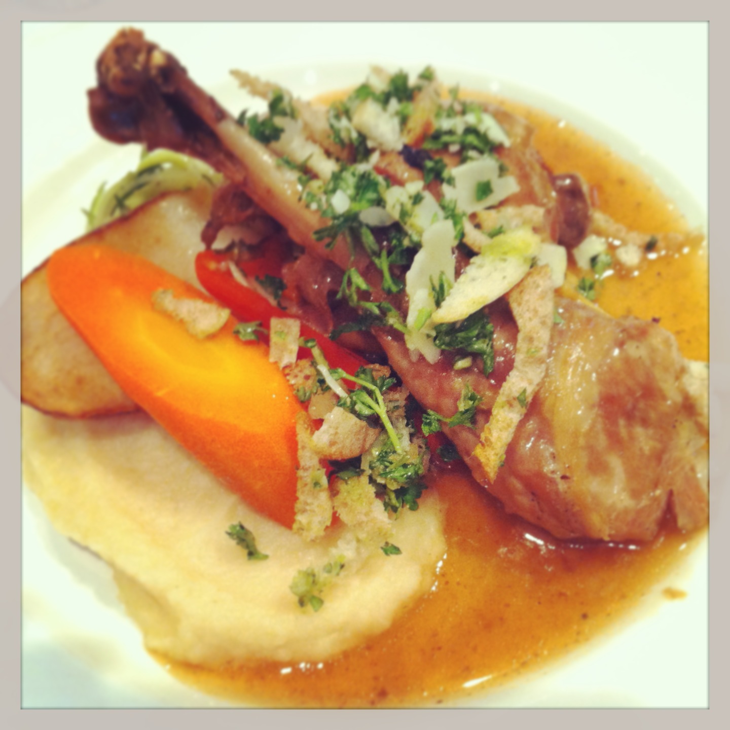 Ou encore cette cuisse de dindonneau confite sur une poêlée d’artichauts et poivrons grillés au balsamique, glace de volaille au marsala gremolata et basilic :