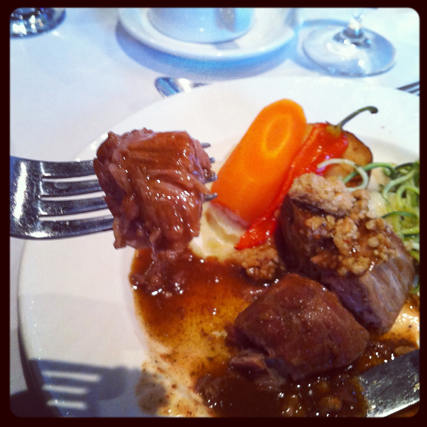 Ou ce duo de mignon et joue de porc glacés à l’érable, crumble aux oignons et réduction de caribou aux baies de genièvre (la joue se défait à la fourchette ET ce plat est actuellement encore sur le menu – un must!) :