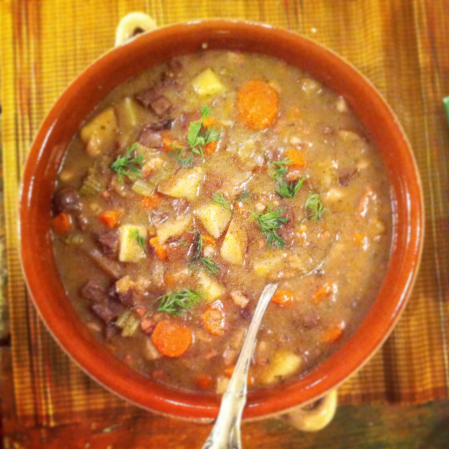 5. Déglacer avec le vin, ajouter le bouillon, les légumes et le persil, saler et mettre au four pendant 2 heures à 350°F. Servir dans des petits plats de grès ou ramequins préalablement chauffés au four avec des croûtons à l’ail et une salade verte.