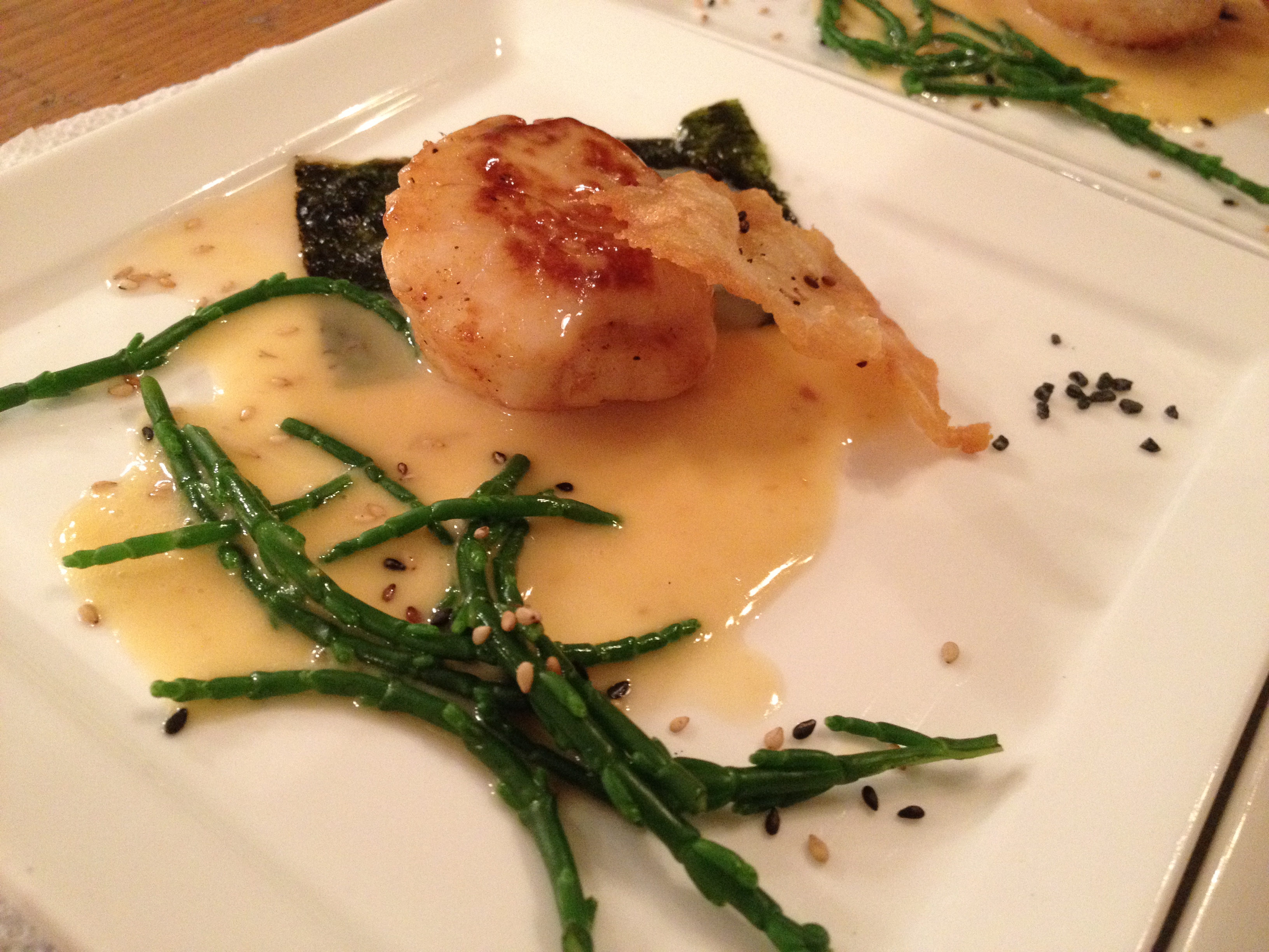 J’étais tellement émue de retrouver de la salicorne dans mon assiette. Une magnifique plante marine que l’on retrouve le long des côtes du Golfe Saint-Laurent, mais rarement dans nos assiettes! Et que dire de la pétoncle. Un de mes mets favoris, ici superbement relevé avec la sauce au beurre blanc miso, citron (encore un favori!) et au gingembre :