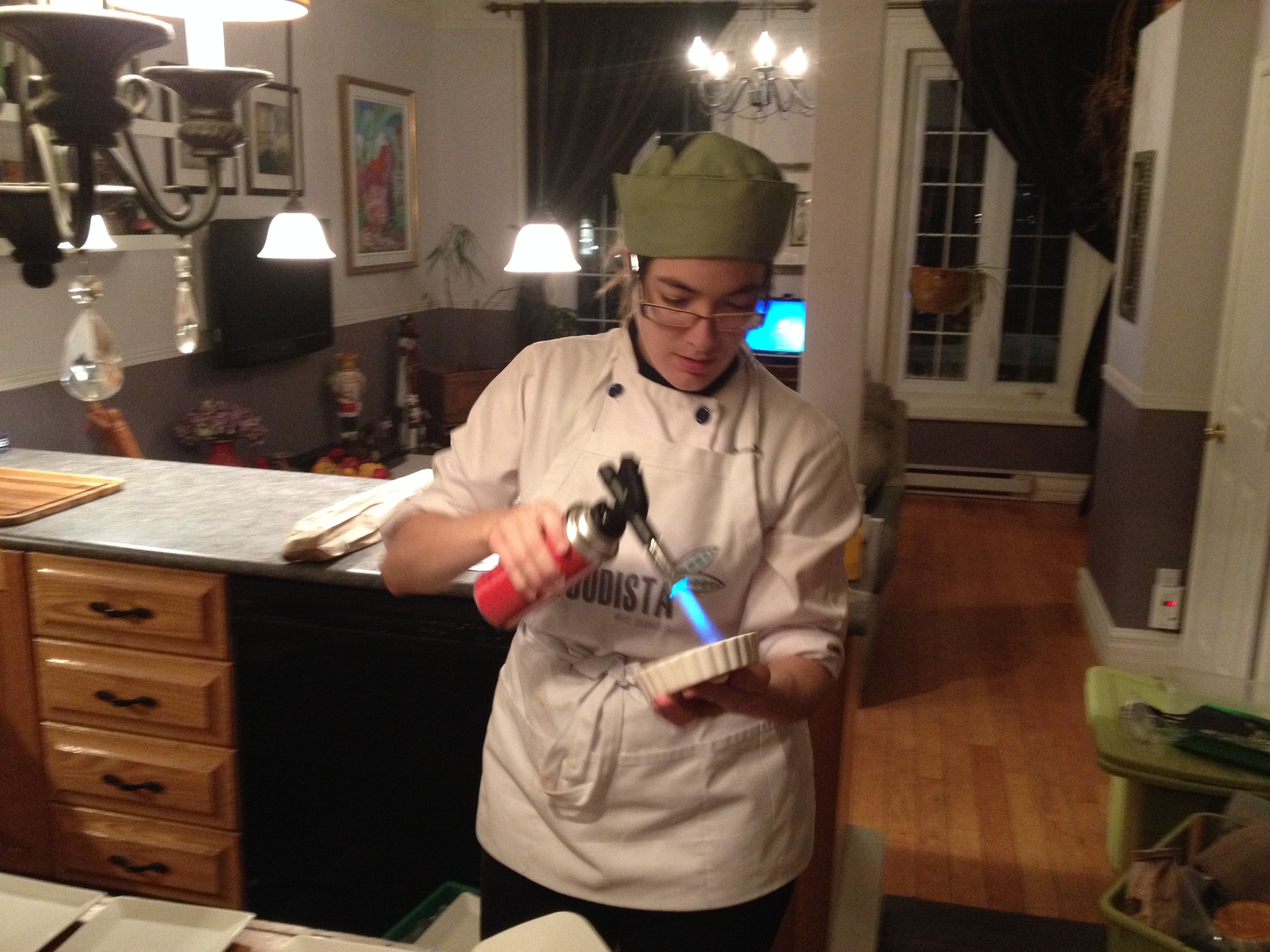 Comme nous sommes peu nombreux au bureau, cela fait maintenant trois années de suite qu’on fait nos partys de Noël « maison » avec un chef à domicile. Les deux premières années furent exceptionnelles (entrée de trilogies de saumon, foie gras, tarte tatin aux pommes et cheddar avec coulis de framboises – que j’ai tenté de reproduire ici) mais nous avons connu l’apothéose à Noël dernier avec Héloïse Leclerc, la blogueuse culinaire professionnelle et chef chez Foodista en mission connue pour son blogue 180 degrés, dorénavant surtout connue pour ses prestigieux Resto-bulle, un concept de restaurant clandestin dont on ne connaît la destination que quelques jours