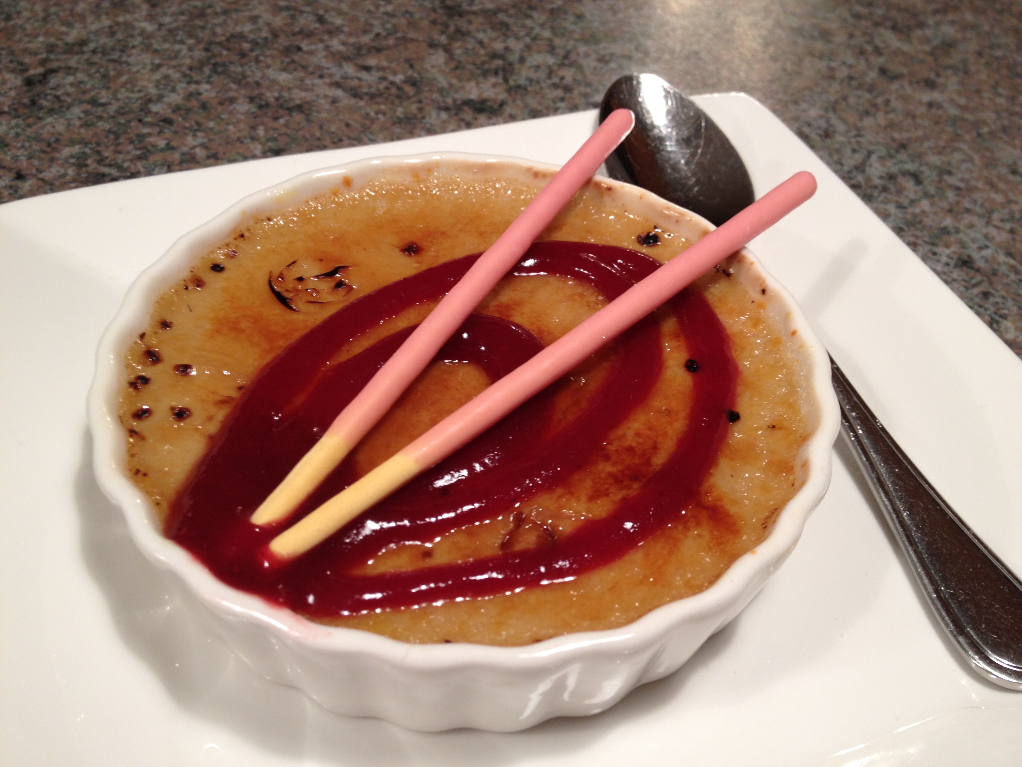 Et on termine en délicatesse avec cette crème brûlée arômatisée aux cinq épices et coulis de cerises noires :