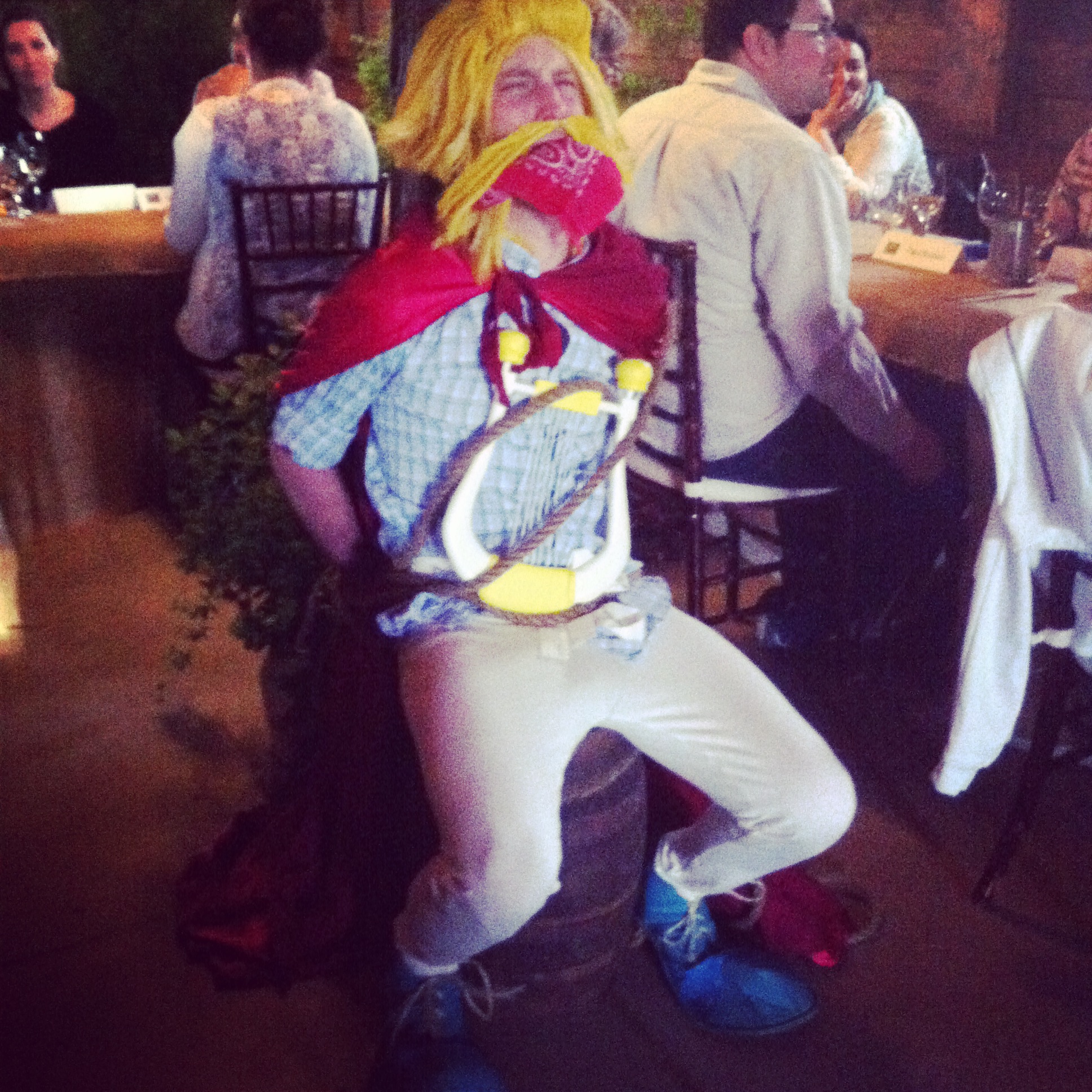 Puis notre hôte, le très sérieux Gastronomix, est venu nous souhaiter la bienvenue en personne pour ensuite nous mener à la grange ancestrale dans laquelle le repas allait prendre place. Le personnage vaut deux photos :