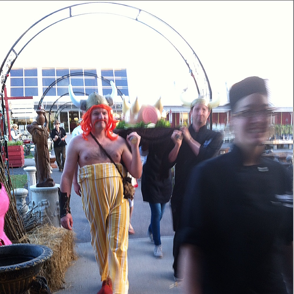 Voici venir la grande vedette de la soirée : tout un cortège de plats portés à l’épaule tel ceux servis dans les Douze travaux d’Astérix et cuisinés par le cuisinier des titans, Mannekenpix le Belge. Quel moment spectaculaire et attendu! Voyez ce court vidéo Instagram du cortège au coucher de soleil (crédit vidéo : Catherine Ladouceur).