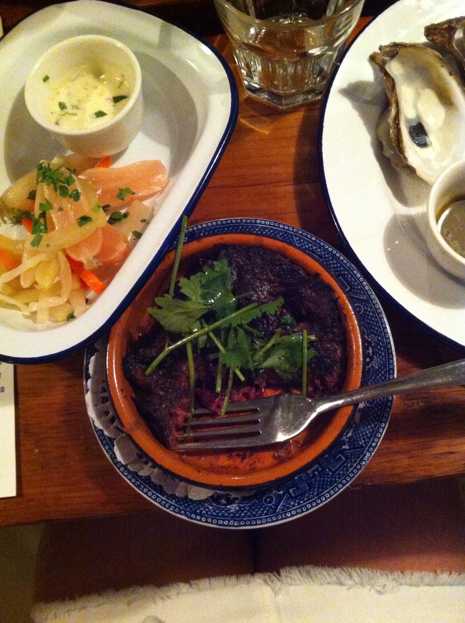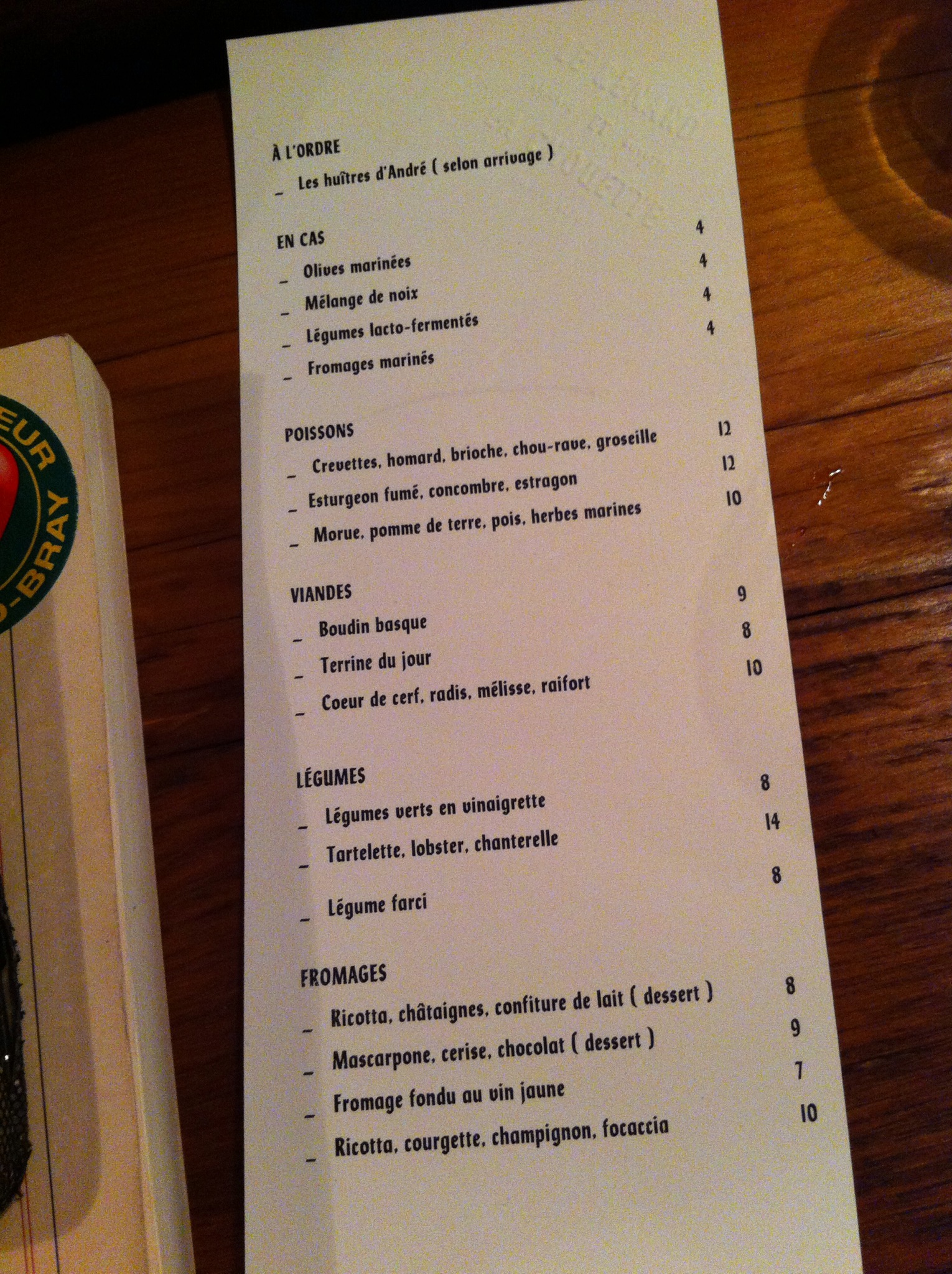 Comme j’étais seule et que je n’avais pas grand appétit, j’ai choisi 4 huîtres (j’aurais pu faire un choix plus original mais je ne peux pas résister aux huîtres), des légumes lacto-fermentés (il faut bien manger des vitamines) et du boudin basque.