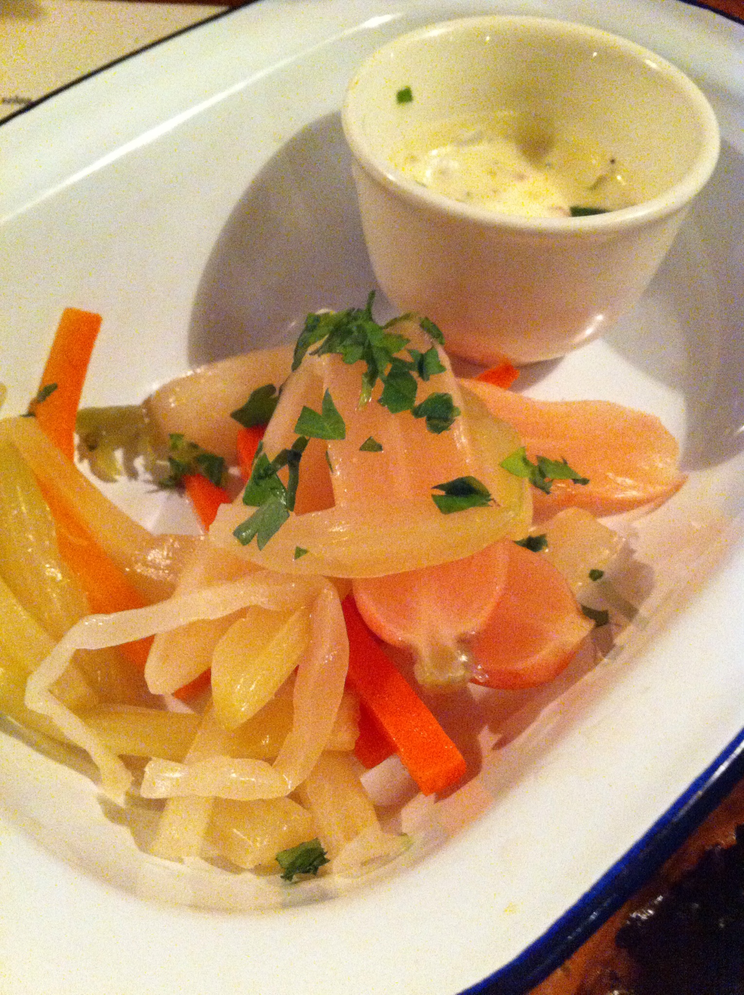 N’ayant pas de machine pour mettre mes aliments sous vide (en fait, la machine, c’était ma bouche!), mon fenouil et mes carottes étaient moins translucides et disons… plus brunies par l’oxydation mais le goût y était. Légèrement salé, légèrement moins croquant… Avec la petite trempette, hmmmm! Quel régal!