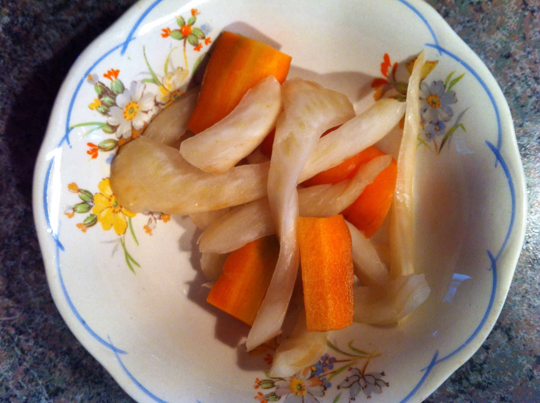 J’ai tenté de reproduire à la maison les légumes lacto-fermentés selon les directives du propriétaire (soit dit en passant, ce sont les mêmes propriétaires que le Bouchon du Pied Bleu) : en scellant sous vide carottes et fenouil, en y ajoutant du sel pour l’équivalent de 1% du poids des légumes, on met sous vide et on laisse reposer pendant 48 heures à la température pièce.