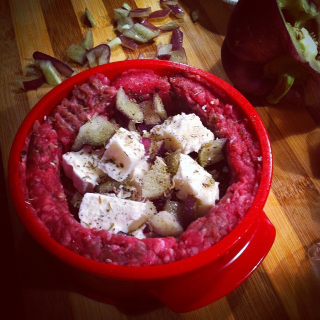 J’aime bien « pimper » ma boulette en mélangeant la viande hachée avec un oignon émincé grossièrement, ça fait de belles petites explosions de saveur en bouche. J’y ajoute parfois un oeuf, de la chapelure, du couscous, des fines herbes…