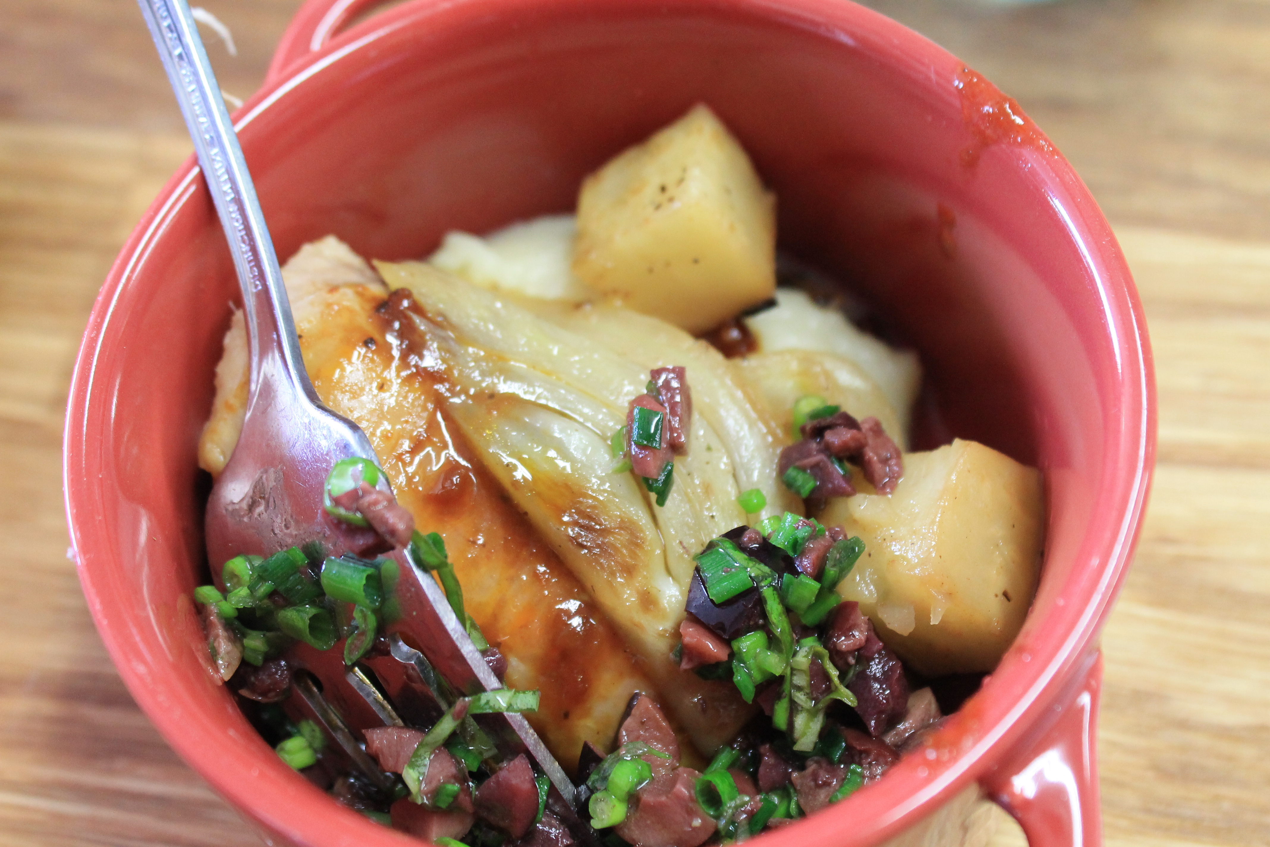 Cette pintade assaisonnée sera disponible à l’automne. Pour mettre en valeur ce produit, Marjorie a accompagné le plat de purée de céleri rave, de cubes de panais, de fenouil, d’anis, d’olives kalamata et de ciboulette. Je retiens cet ajout inattendu d’olives. Un délice!