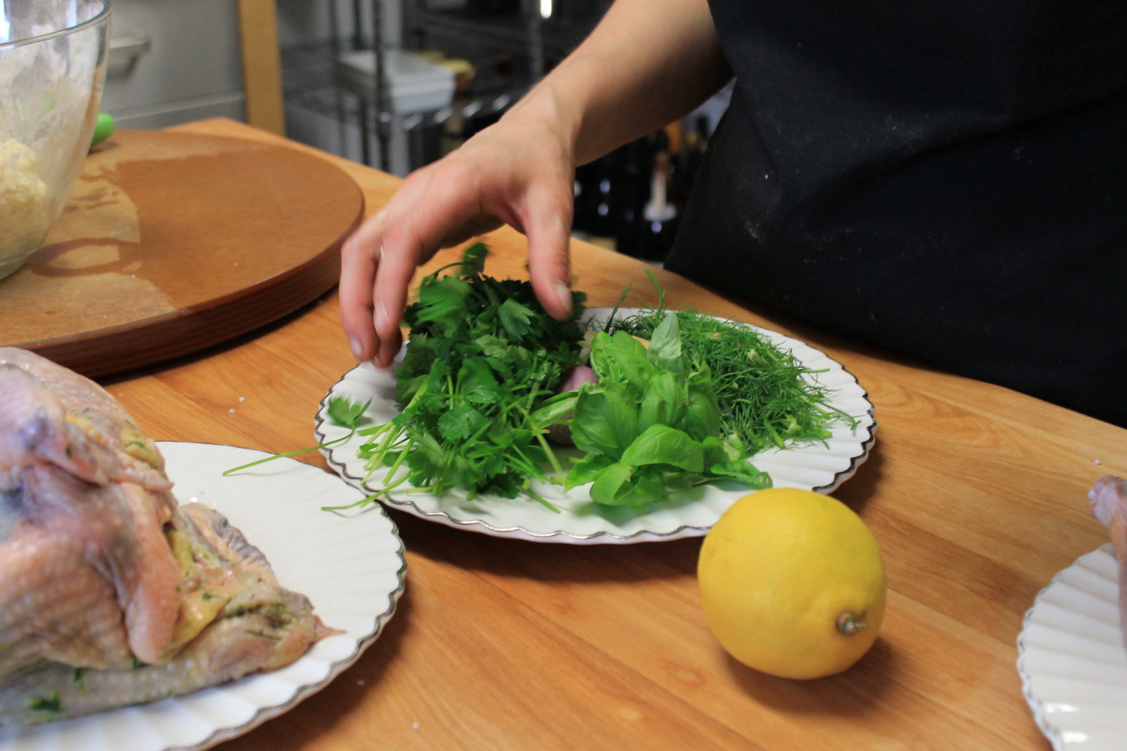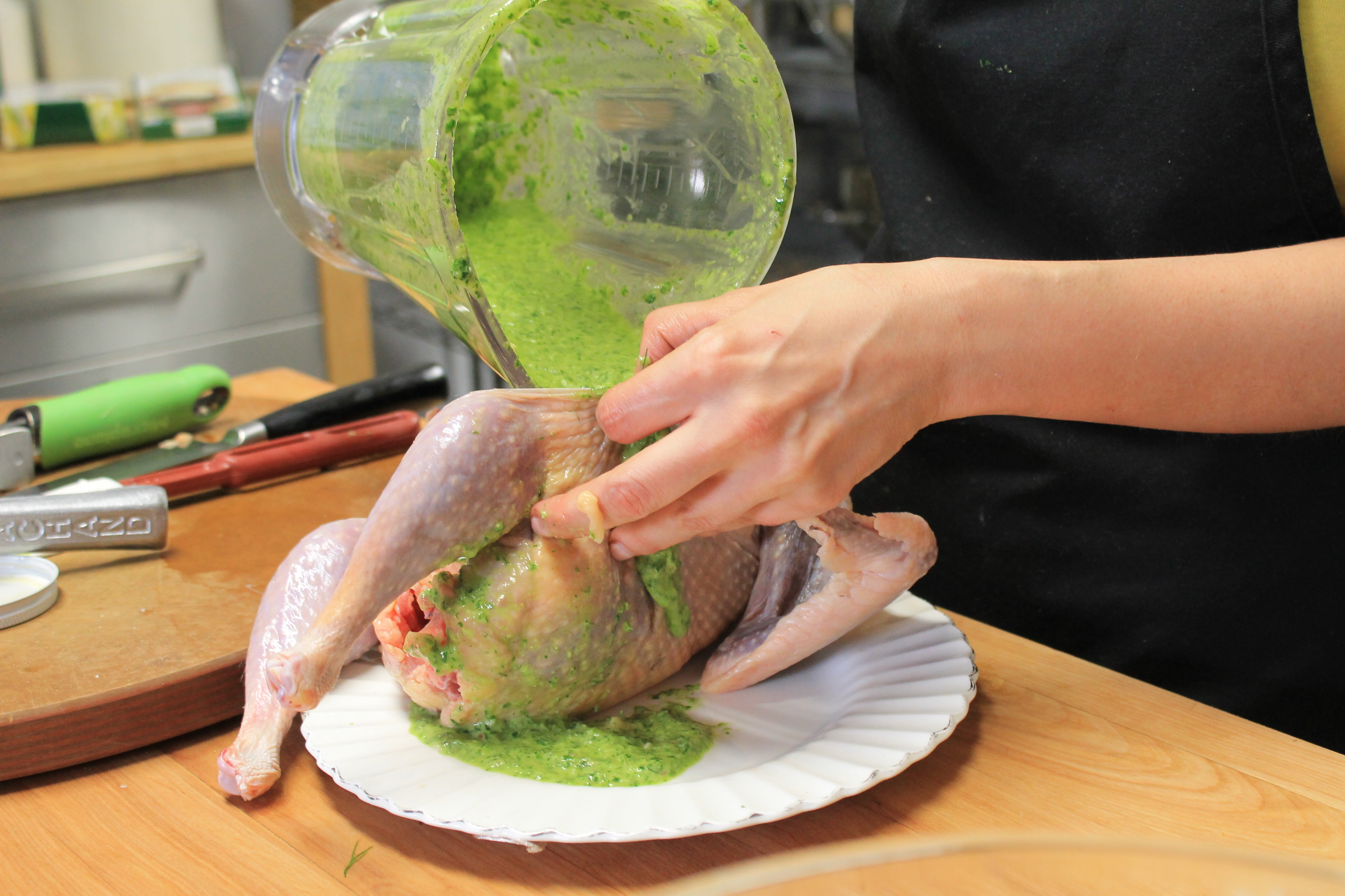 Ensuite, Marjorie insère entre la peau et la chair une garniture aromatique composée d’herbes, de citron, d’oignon vert, de gingembre, d’ail et d’huile.