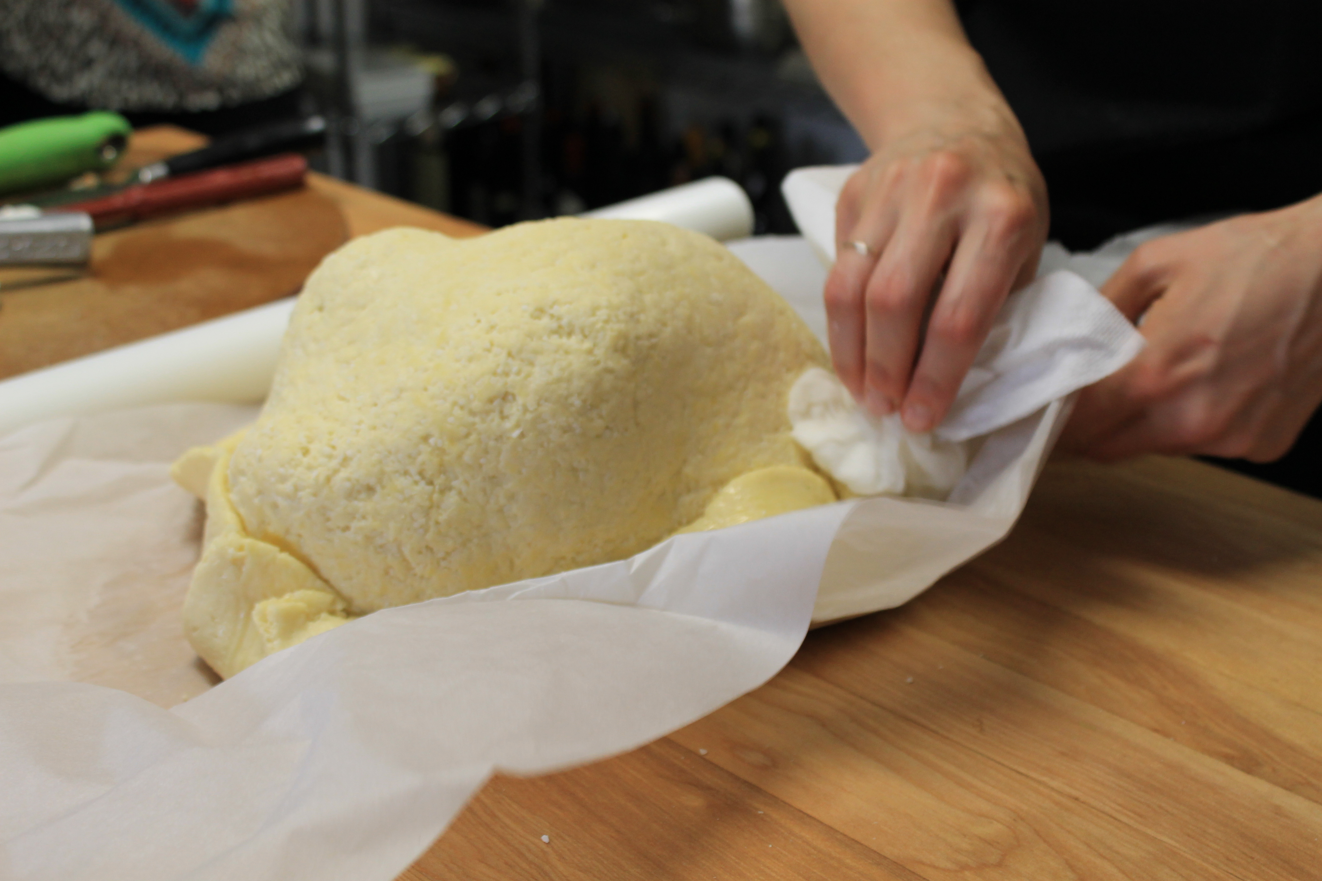 Marjorie prépare tout d’abord la pâte composée de farine, de sel, d’oeufs et d’eau.