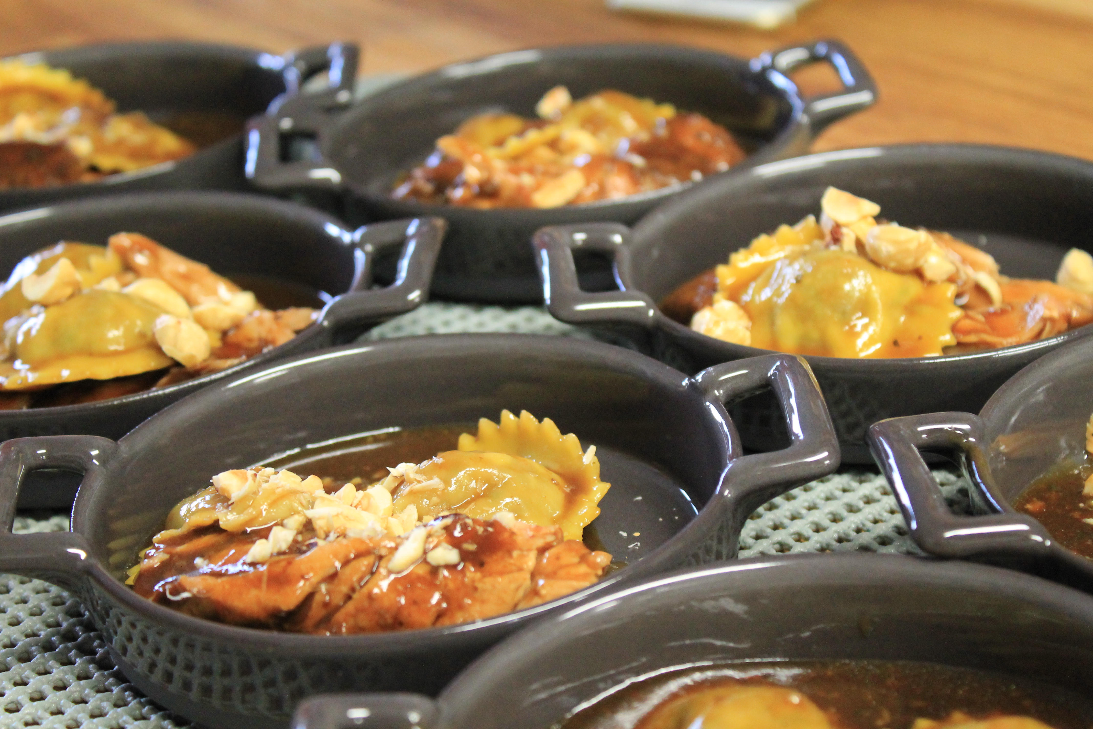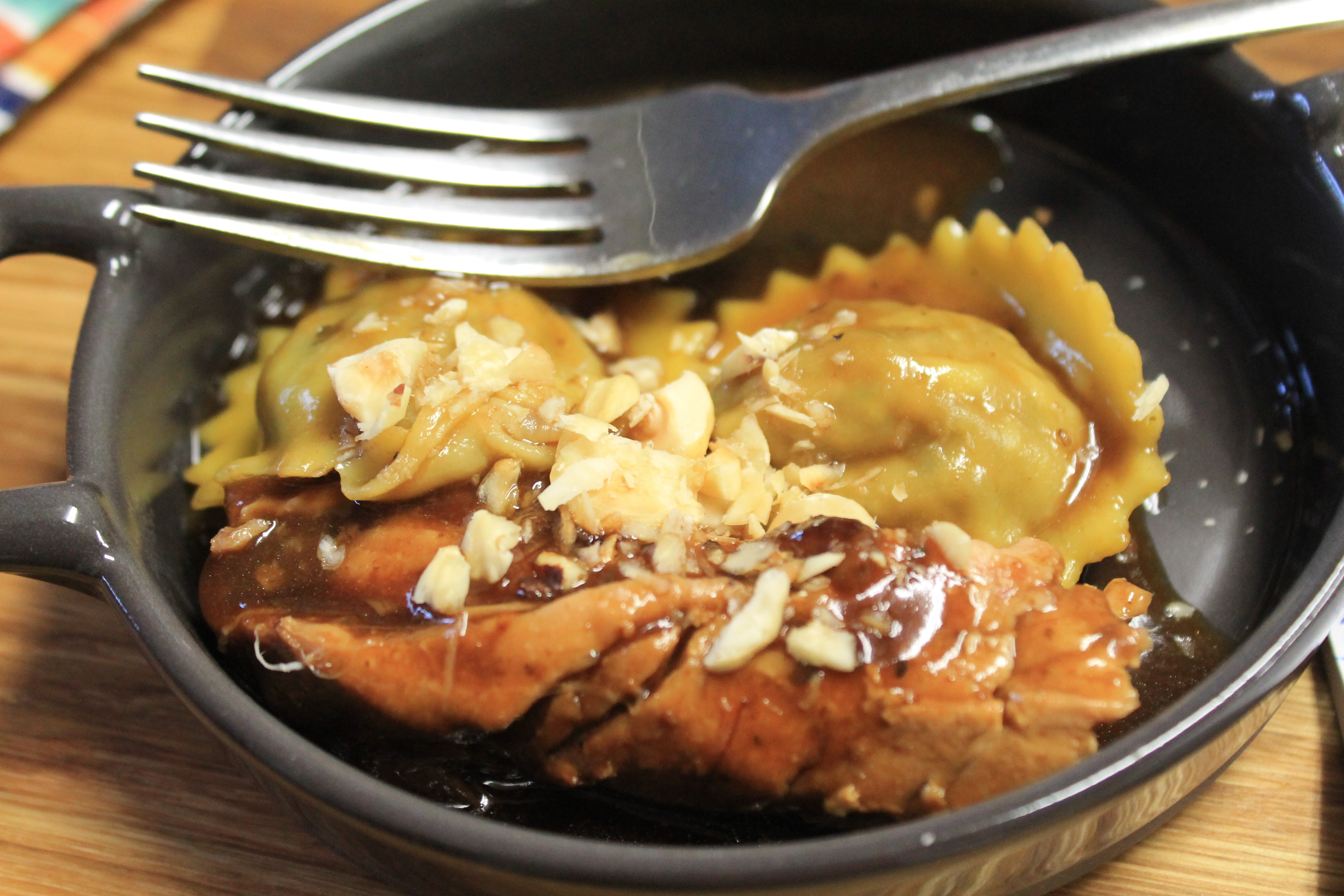 Ce lapin en sauce au fond de gibier, vin rouge et vinaigre balsamique fut servi avec des raviolis aux champignons et des noisettes torréfiées. Fait à noter : chaque produit est vendu sous vide et contient beaucoup de sauce : aucun problème de pénurie de sauce aux dires de Marjorie.