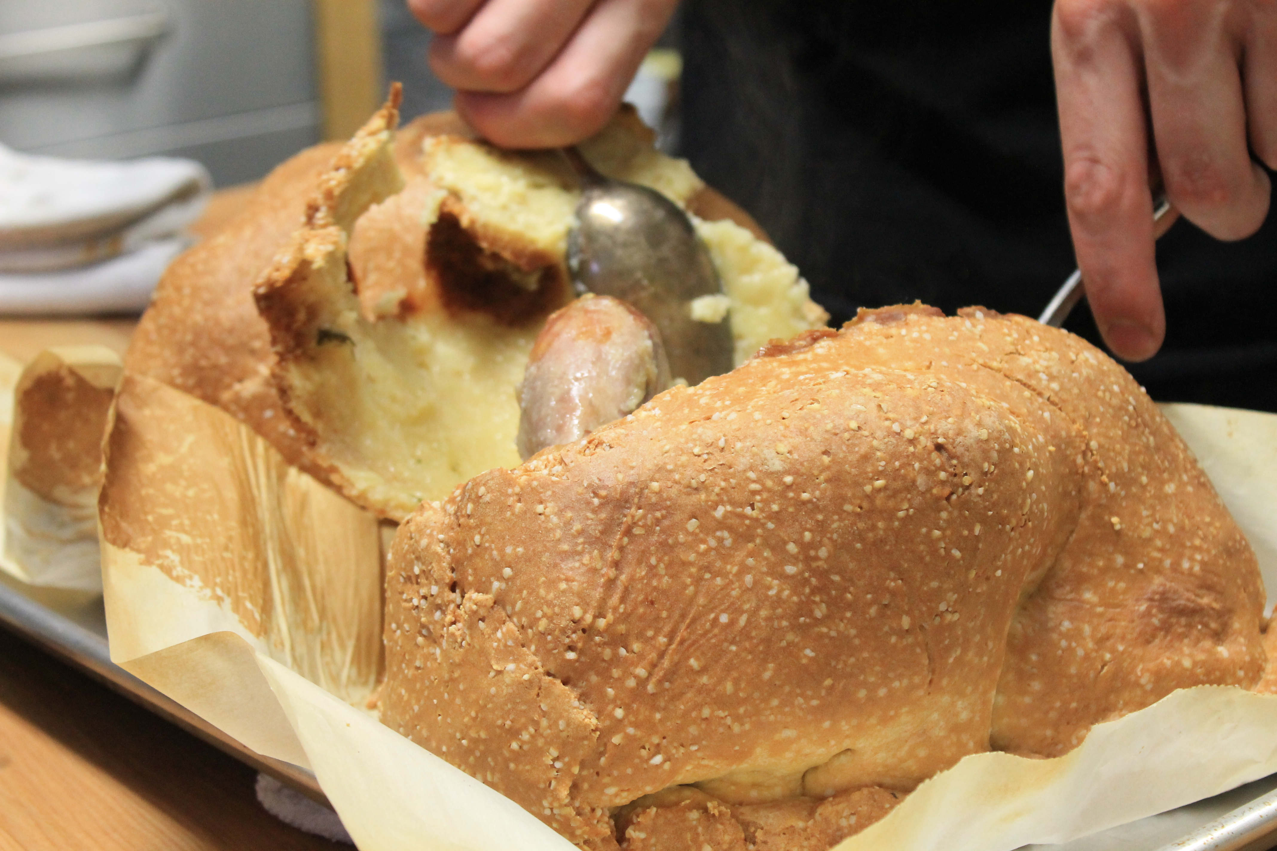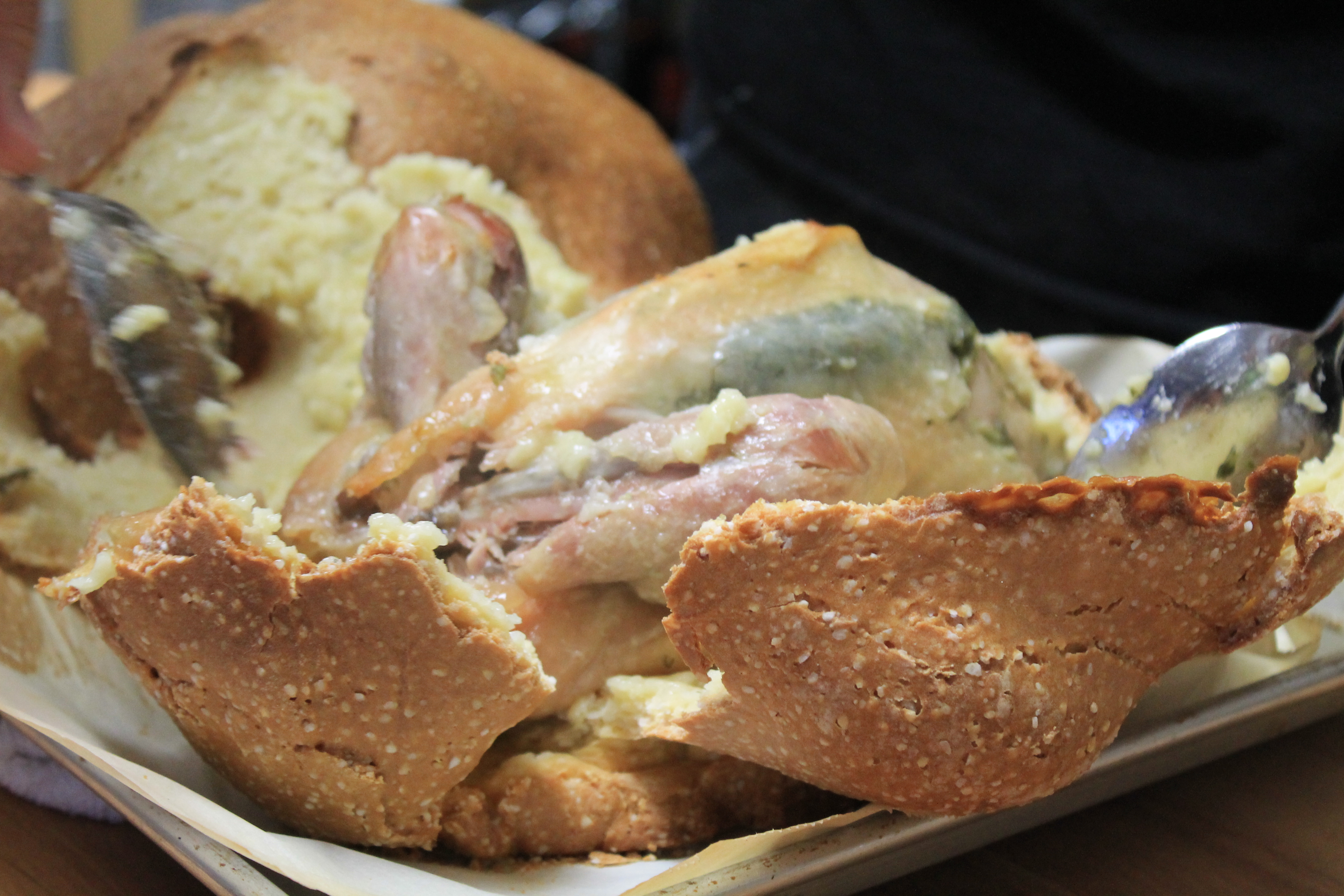 Le résultat est sensationnel, mais surtout absolument savoureux! Au bout de 1h30, l’oiseau ainsi habillé ressort doré à point. La chair est tendre et juteuse puisque la pâte a emprisonné tous les jus de cuisson.
